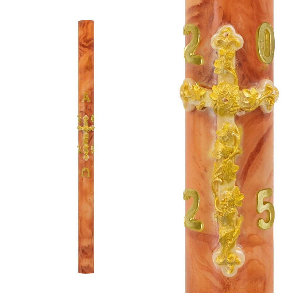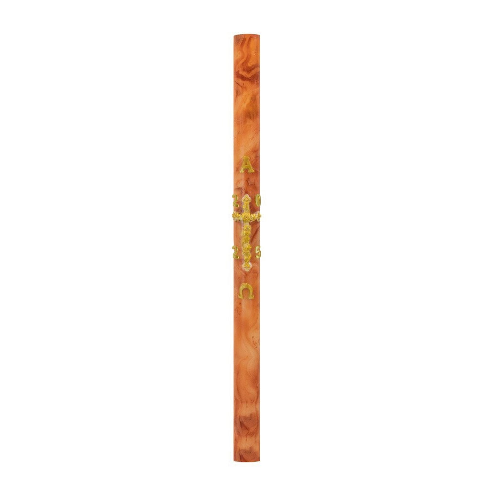 Cero Pasquale dipinto color arancio realizzato in paraffina di primissima qualità. Questo cero presenta applicazioni a rilievo di Croce, Alfa, Omega e anno attuale.