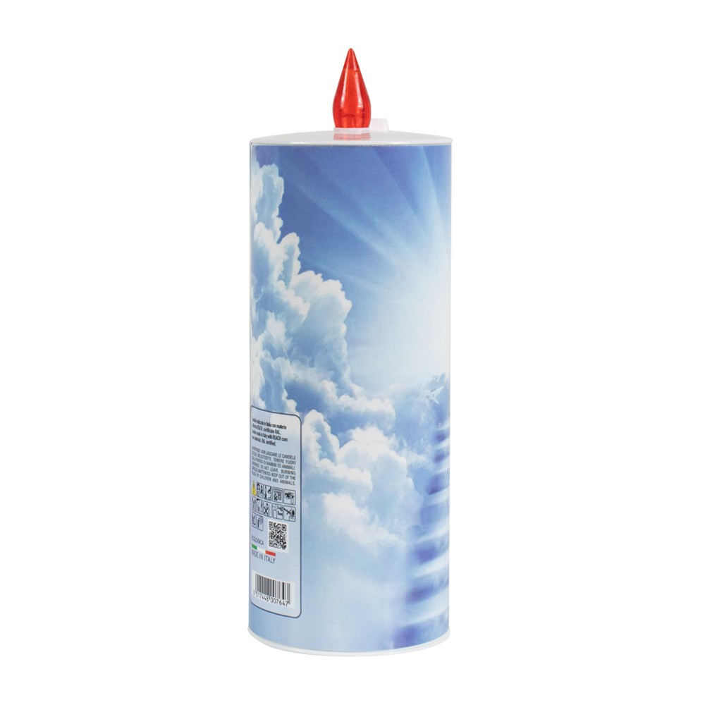 Questo lumino elettrico, usa e getta, ha una durata di 150 giorni ca, è realizzato in carta riciclabile lucida, con immagine raffigurante di un angelo custode con lanterna e bambino che dorme.