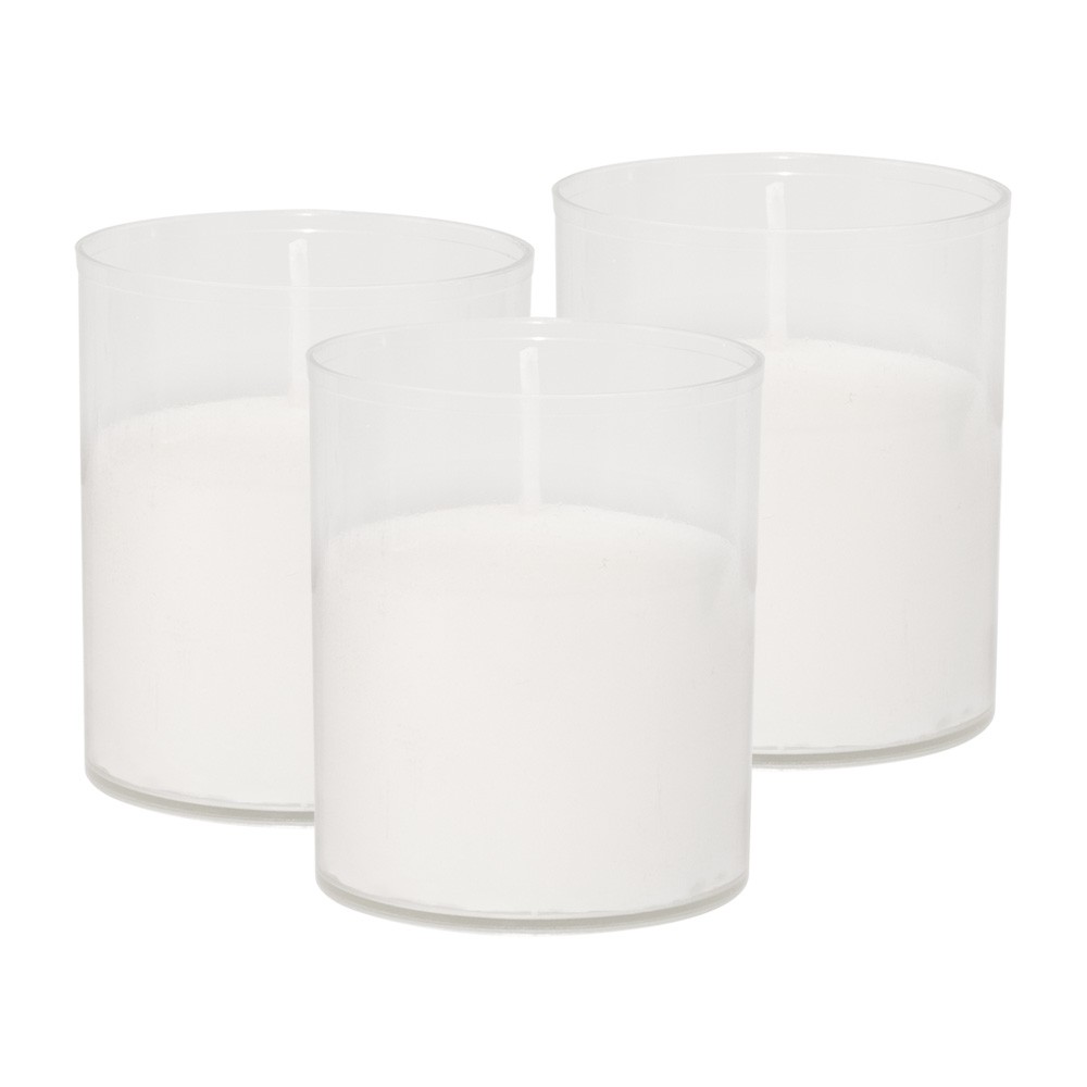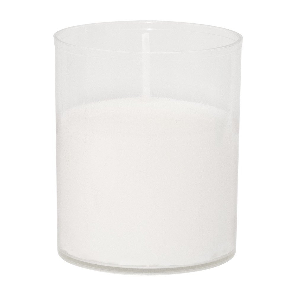 Lumino in cera bianca con contenitore in plastica trasparente.