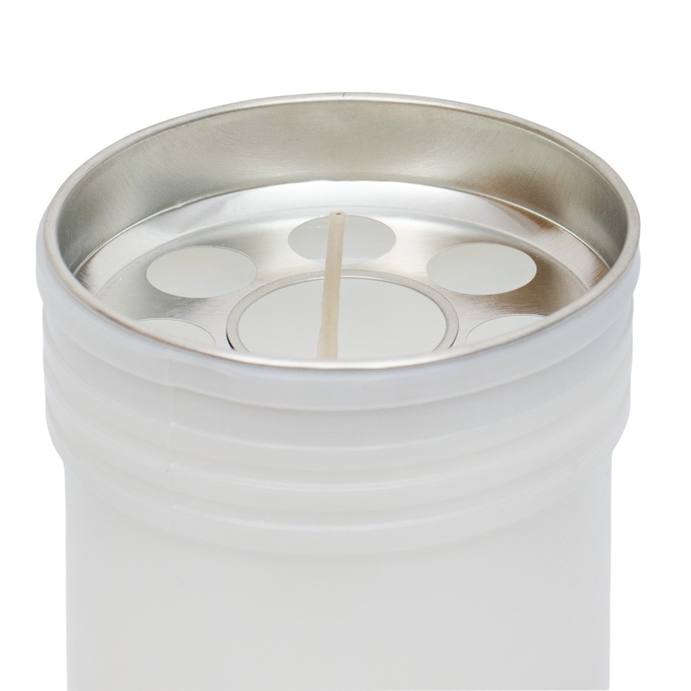 Lumino liturgico in cera bianca confezionato in contenitore in plastica di colore bianco.