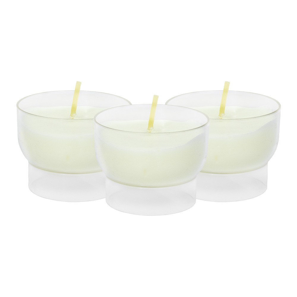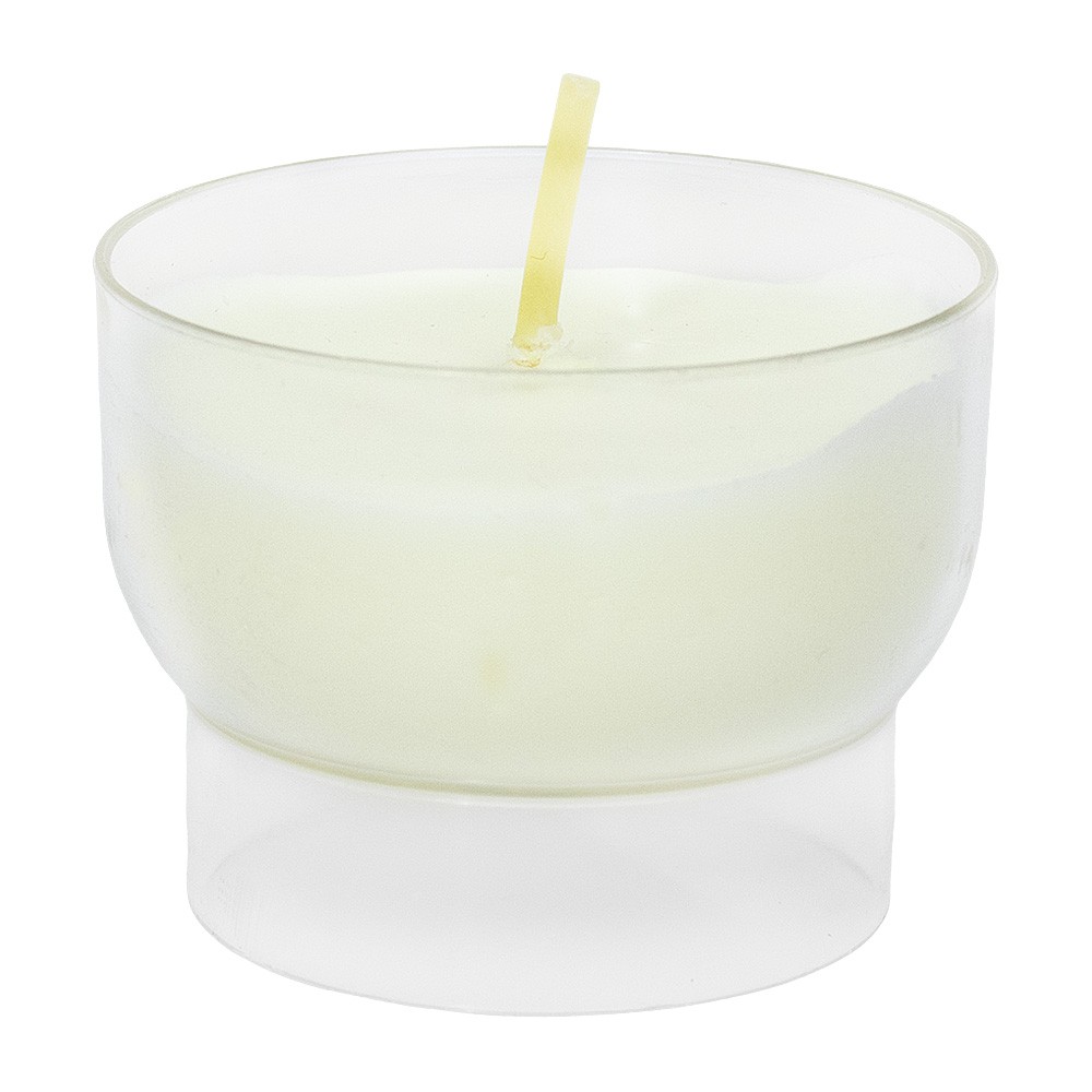Lumino votivo modello "calicetto" in plastica trasparente con cera bianca.