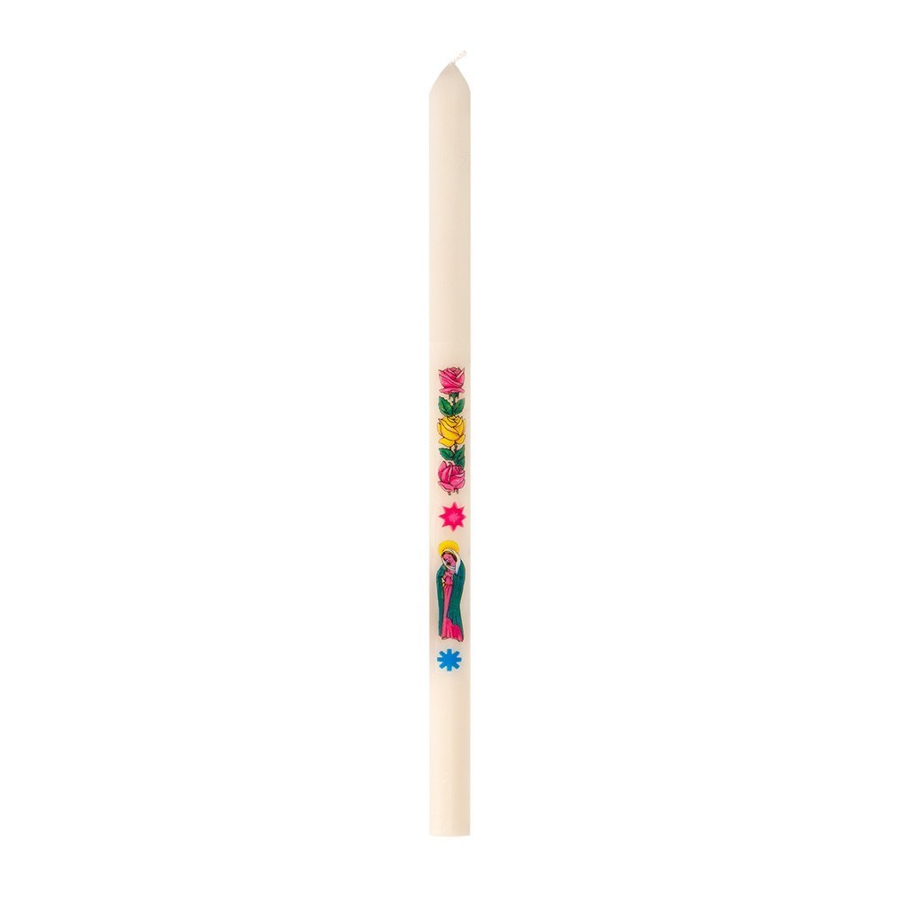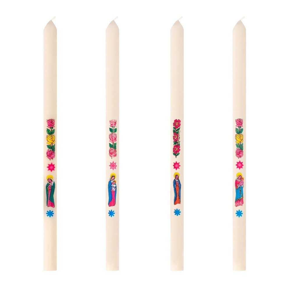 La confezione comprende 200 candele bianche in cera con una raffinata decalcomania della Madonna con Bambino e tre fiori, simbolo di luce e fede.