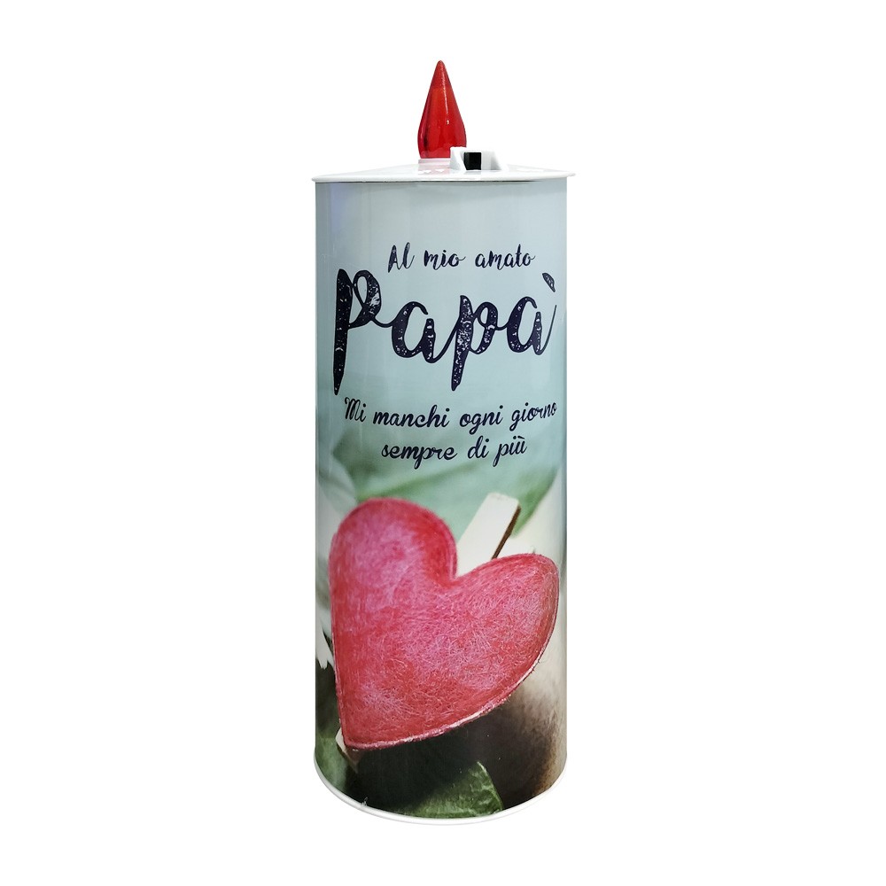 Lumino elettronico dedicato al Papà con preghiera sul retro. Realizzato in cartoncino plastificato blu resistente alle intemperie. Pile alcaline incluse (usa e getta). Luce continua a led rossa della durata di 150 giorni. Prodotto di alta qualità. Made in Italy.