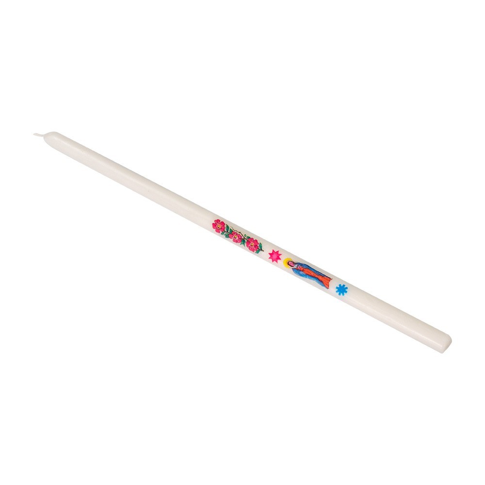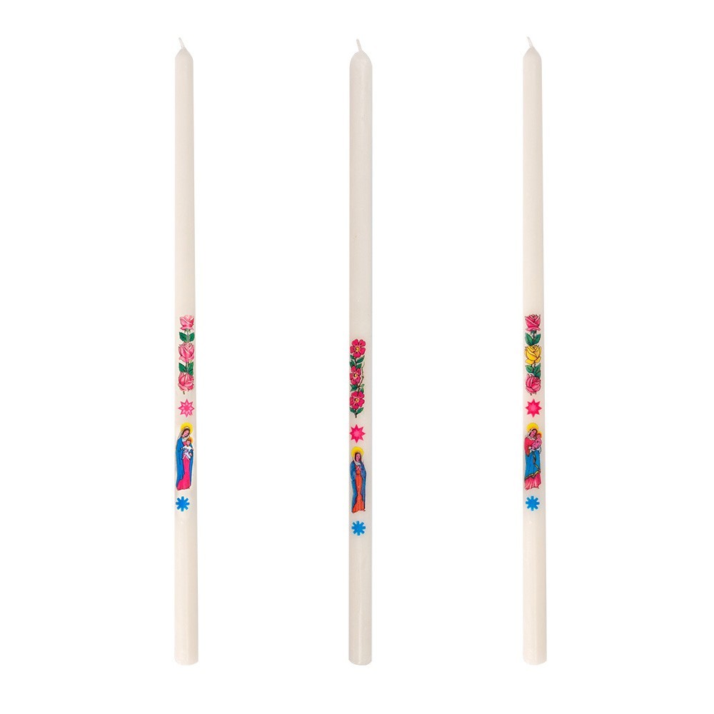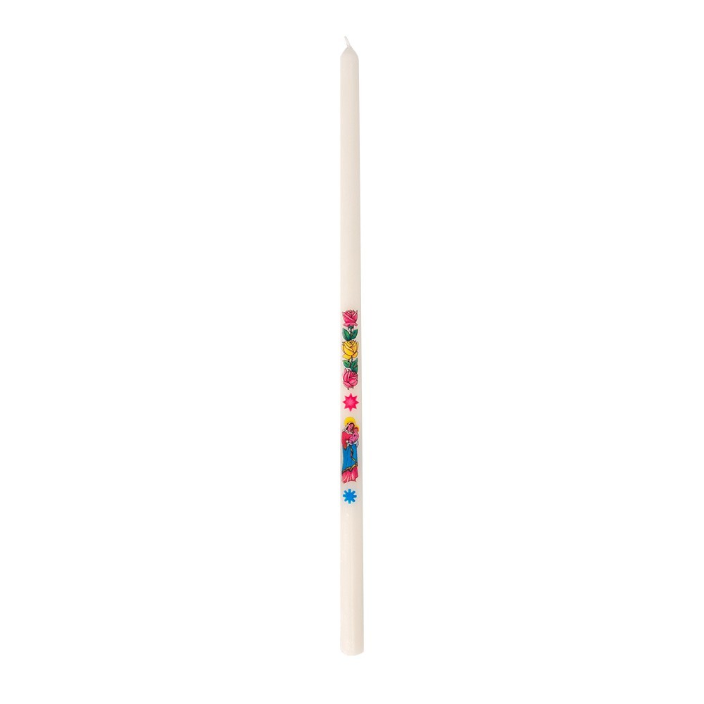 Candela per la candelora in cera. La confezione comprende 100 candele bianche in cera con decalcomania della Madonna con Bambino e tre rose. La candela è alta 35 cm ca con diametro 1,4 cm.