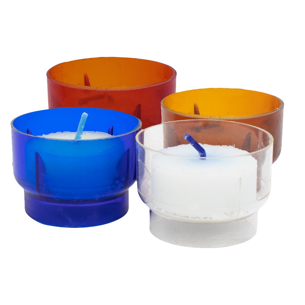Lumini votivi in cera bianca disponibili in diverse colorazioni.