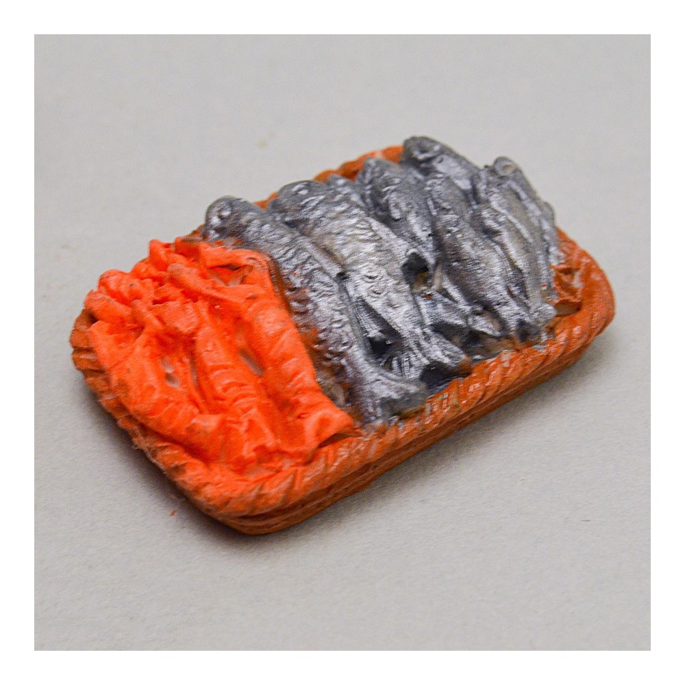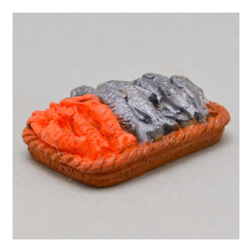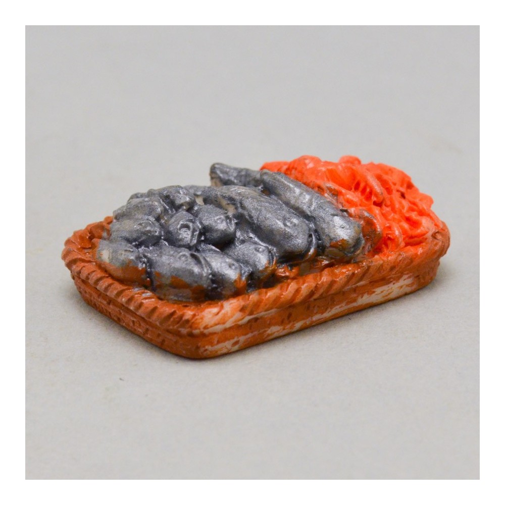 Cesto rettangolare in resina con pesci per presepe. Misure: 4,5 x 3 cm. Realizzato e dipinto a mano.
