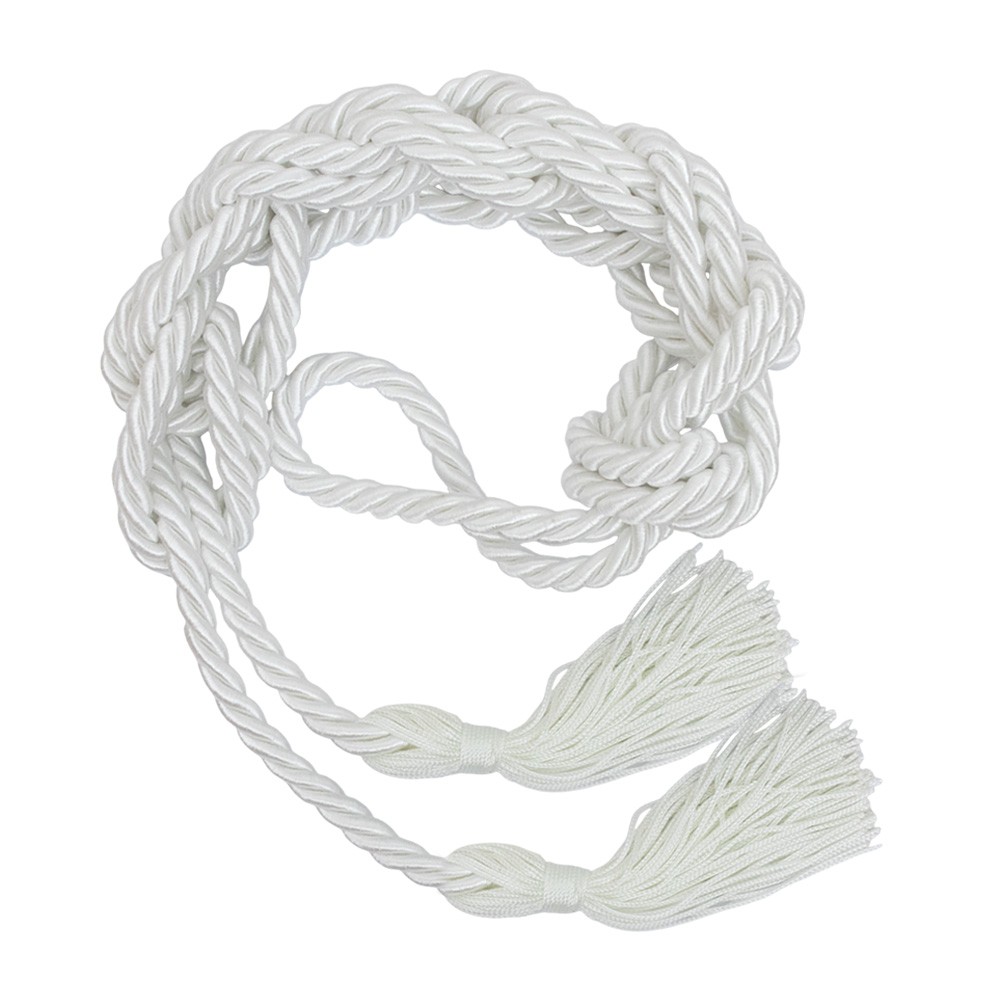 Cingolo bianco lucido in rayon con fiocchetti, particolarmente indicato per tuniche per adulti.
