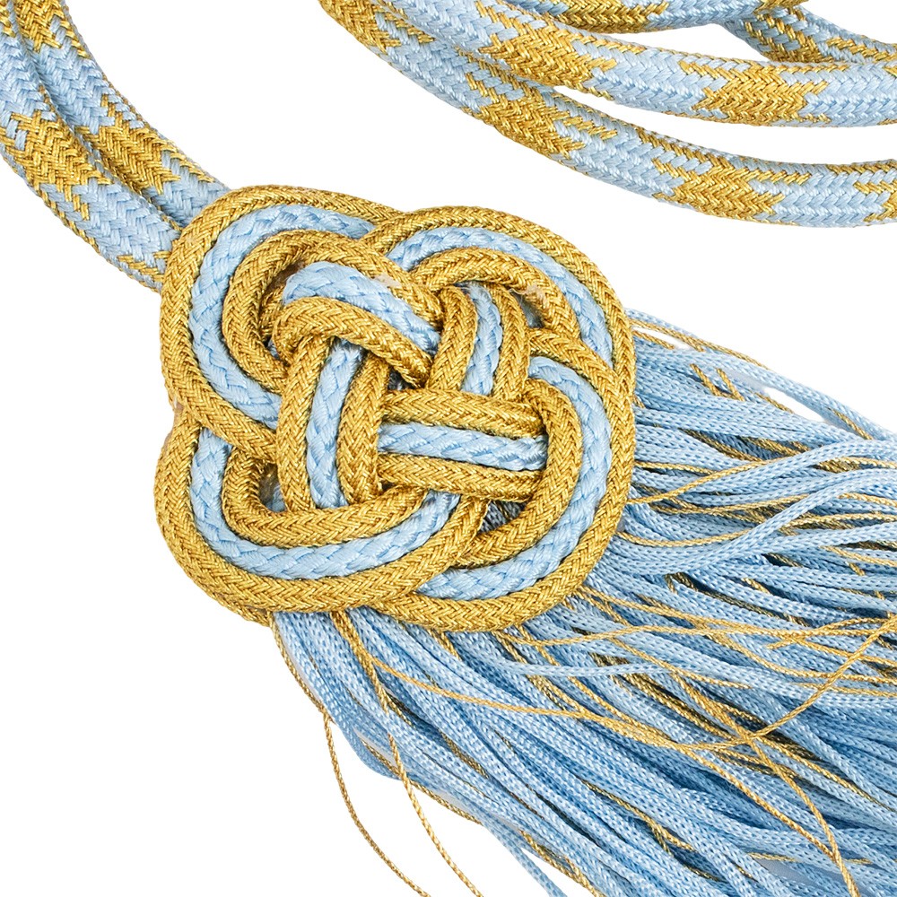 Cordone per croce pettorale celeste e oro con fiocco rosetta e tre passanti ricamati a macchina.