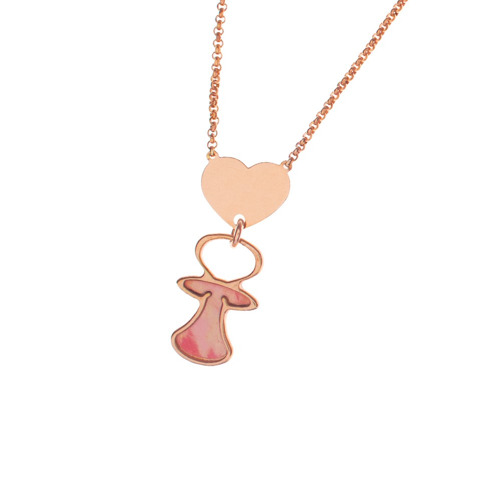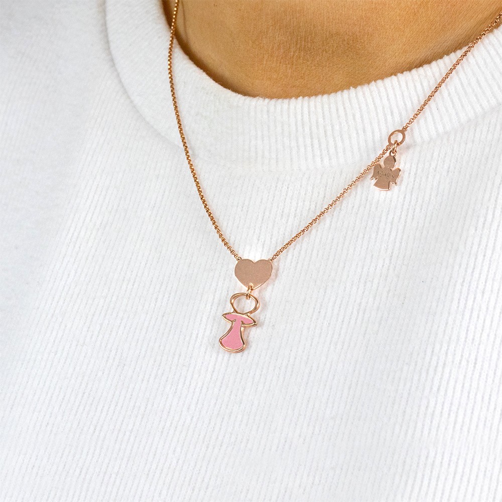 Collana da donna in argento 925, finitura rosè, con pendente a forma di ciuccio color rosa e cuore della collezione Amen gioia di mamma.