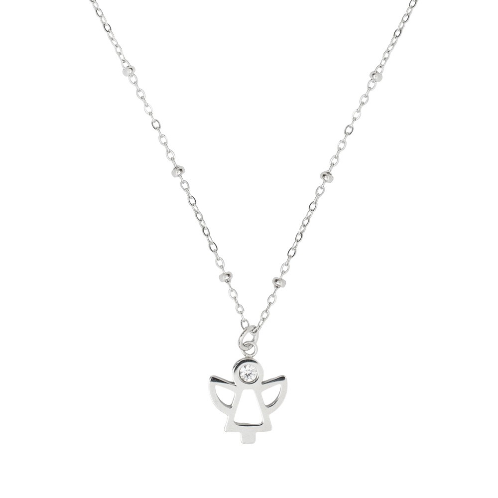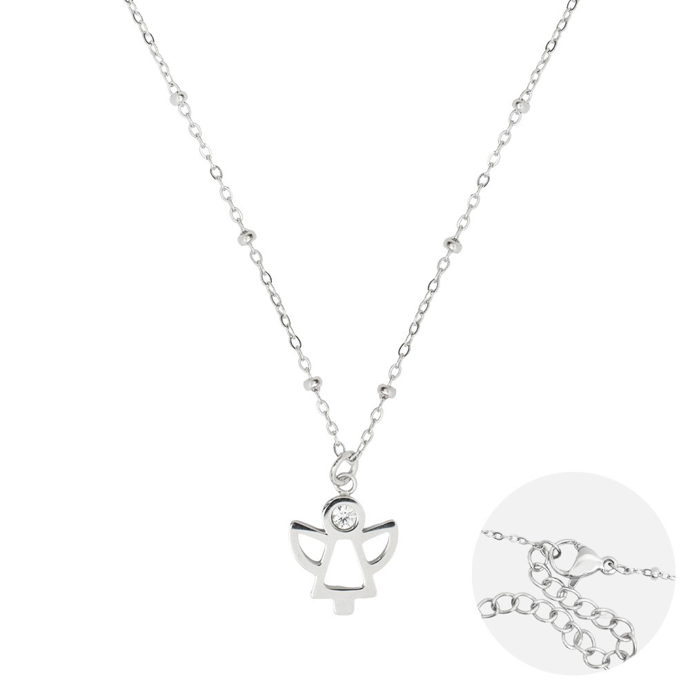 Collana in acciaio finitura color argento completo di pendente sagomato a forma di angioletto con strass centrale.