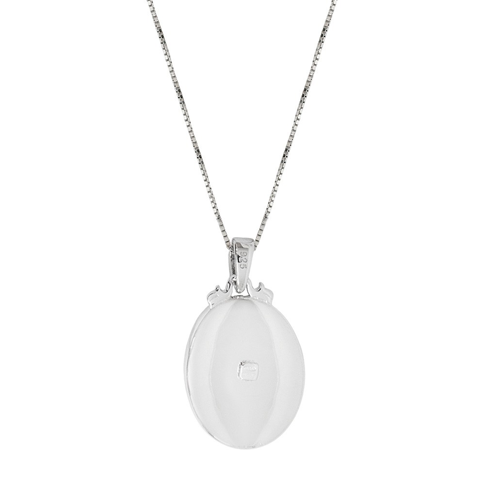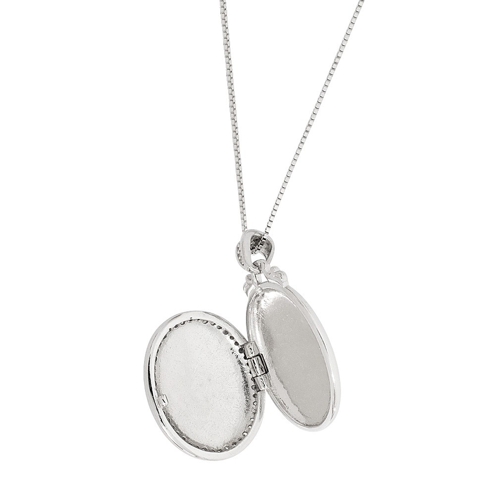 La collana è interamente in argento 925 con ciondolo portafoto apribile dalla forma ovale, impreziosito da zirconi che donano luce e raffinatezza. Sulla parte frontale è presente la delicata sagoma della Madonna Miracolosa, simbolo di protezione e devozione mariana.