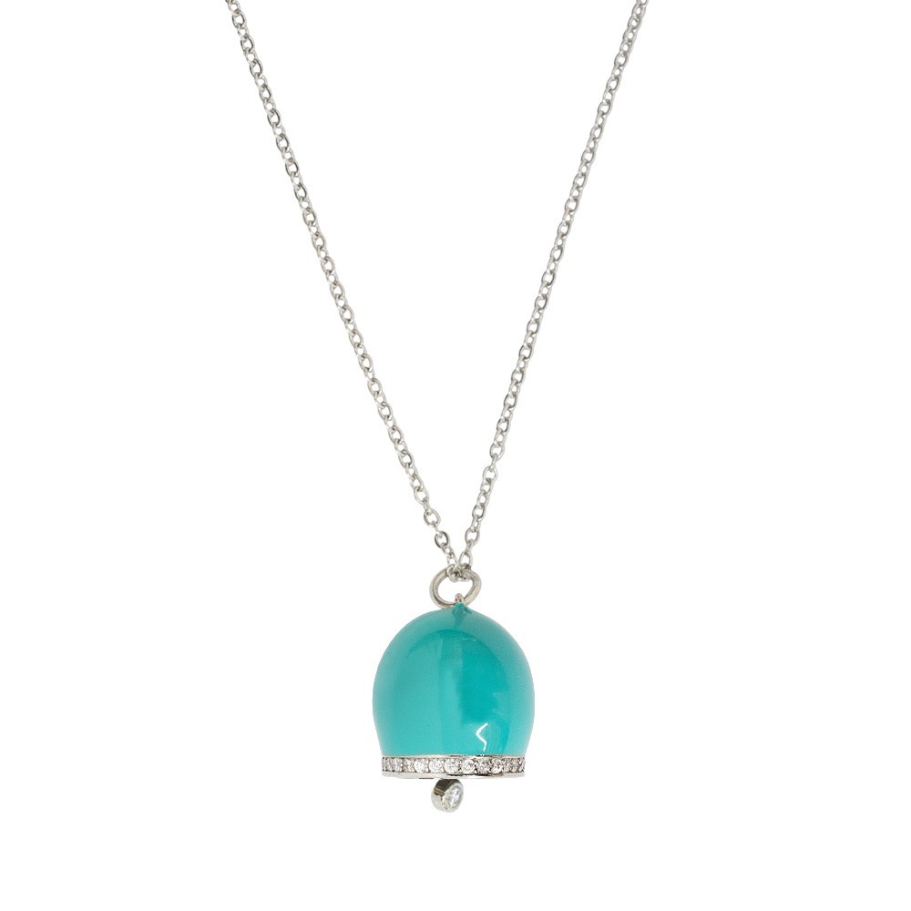 La collana presenta un delicato ciondolo a forma di campanella in acciaio smaltato di colore turchese, arricchito da zirconi che ne esalta l’eleganza. Un gioiello ideale per un utilizzo quotidiano e perfetto come pensiero speciale.