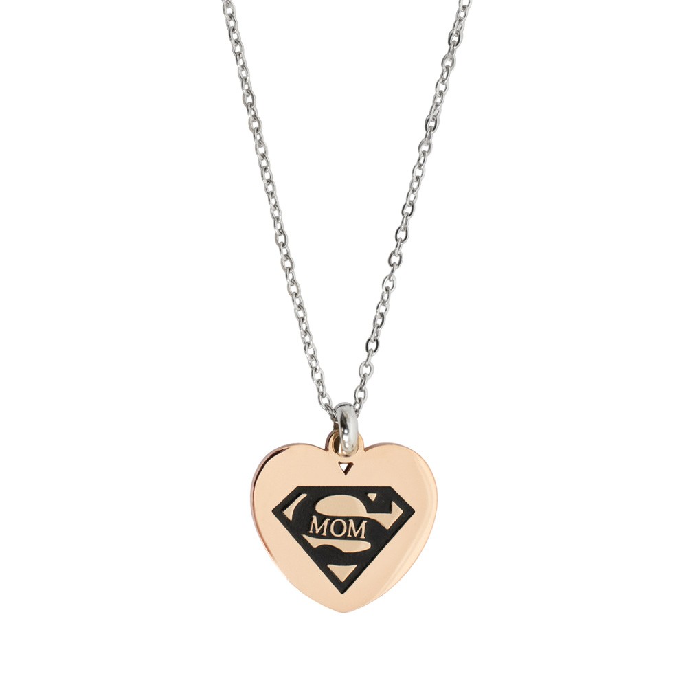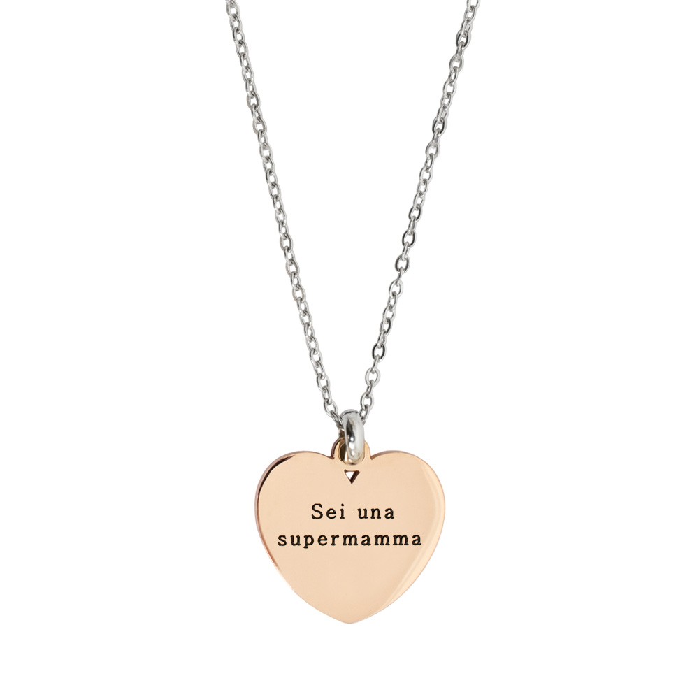 Collana con ciondolo a forma di cuore, interamente realizzata in acciaio anallergico. La catenina presenta una finitura argentata, mentre il cuore è rifinito in color bronzo. Sul fronte è incisa la frase "Sei una super Mamma".