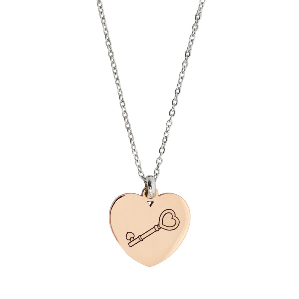 Delicata collana con ciondolo cuore, pensata per esprimere affetto e gratitudine. Interamente realizzata in acciaio anallergico, presenta una catenina argentata e un cuore bronzo con doppia incisione: da un lato la frase "La mamma custodisce le chiavi dell'anima", dall’altro una chiave. Corredato di scatola regalo e shopper coordinata.