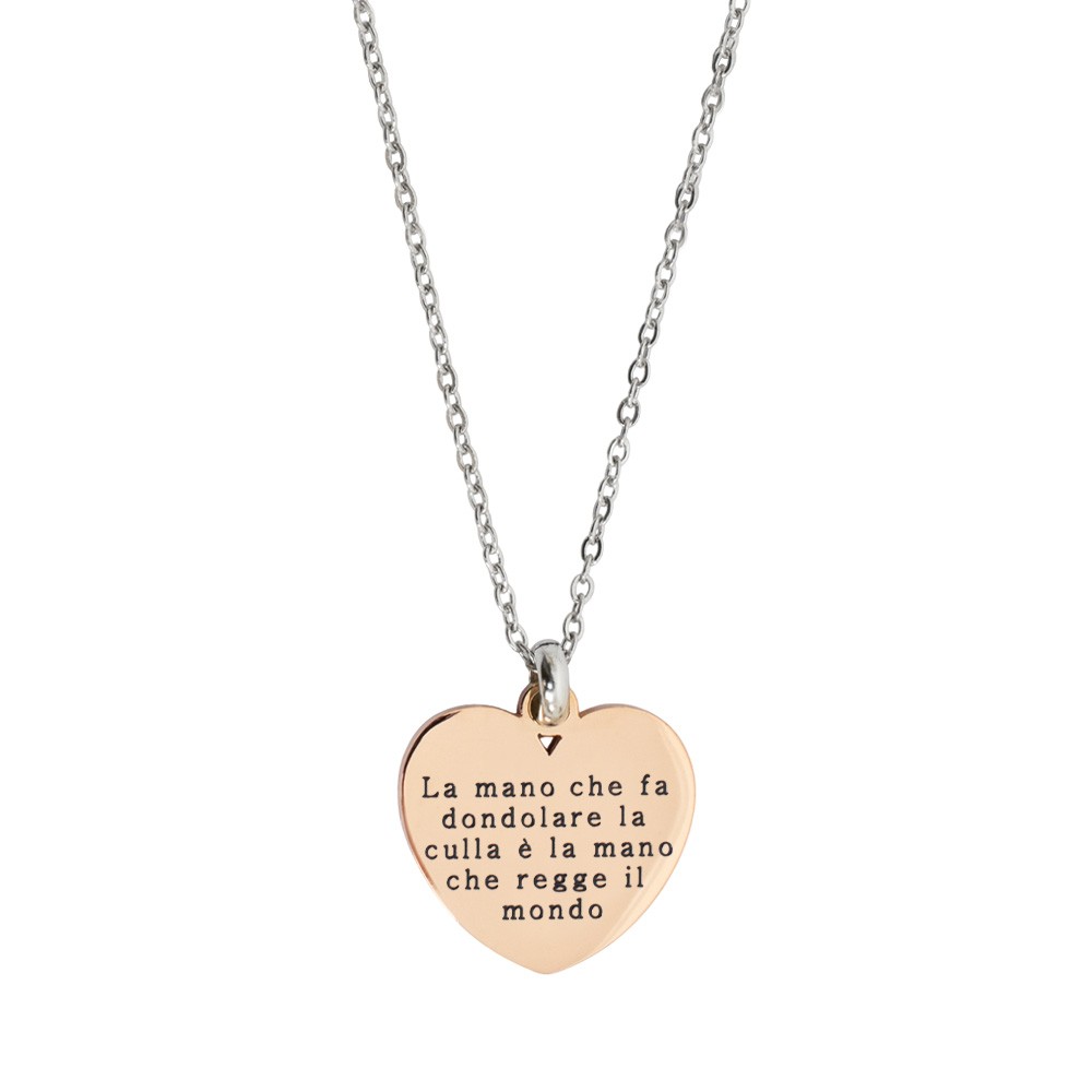 Collana in acciaio con ciondolo a cuore inciso “La mano che fa dondolare la culla è la mano che regge il mondo”. Con scatola regalo e shopper abbinata.