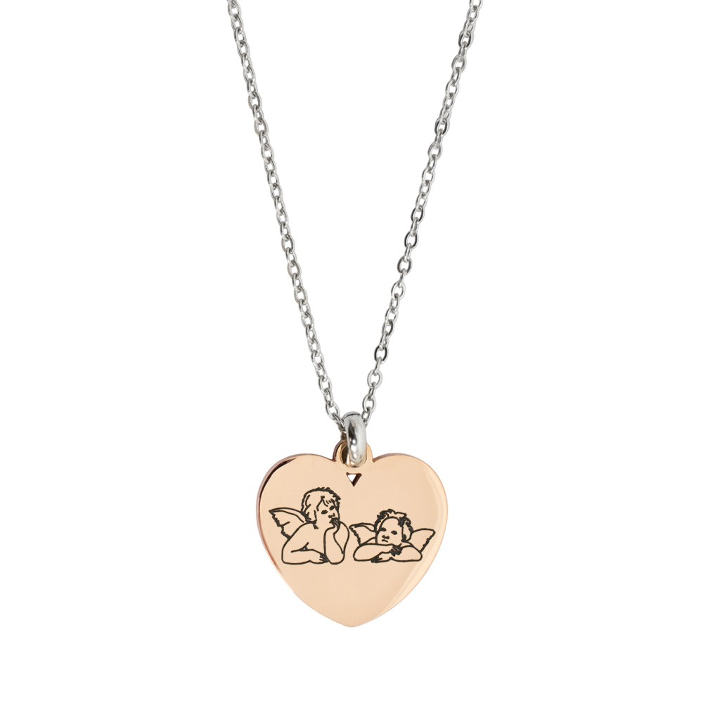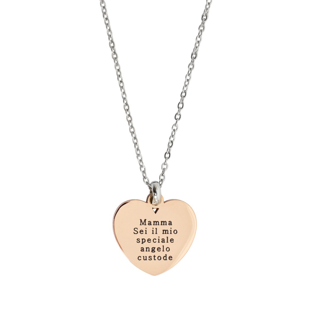 Elegante e delicata collana con ciondolo cuore e dedica alla mamma Interamente realizzata in acciaio anallergico, presenta una catenina argentata e un cuore bronzo con doppia incisione: da un lato la frase "Mamma sei il mio angelo custode", dall’altro due angeli. Corredato di scatola regalo e shopper coordinata.