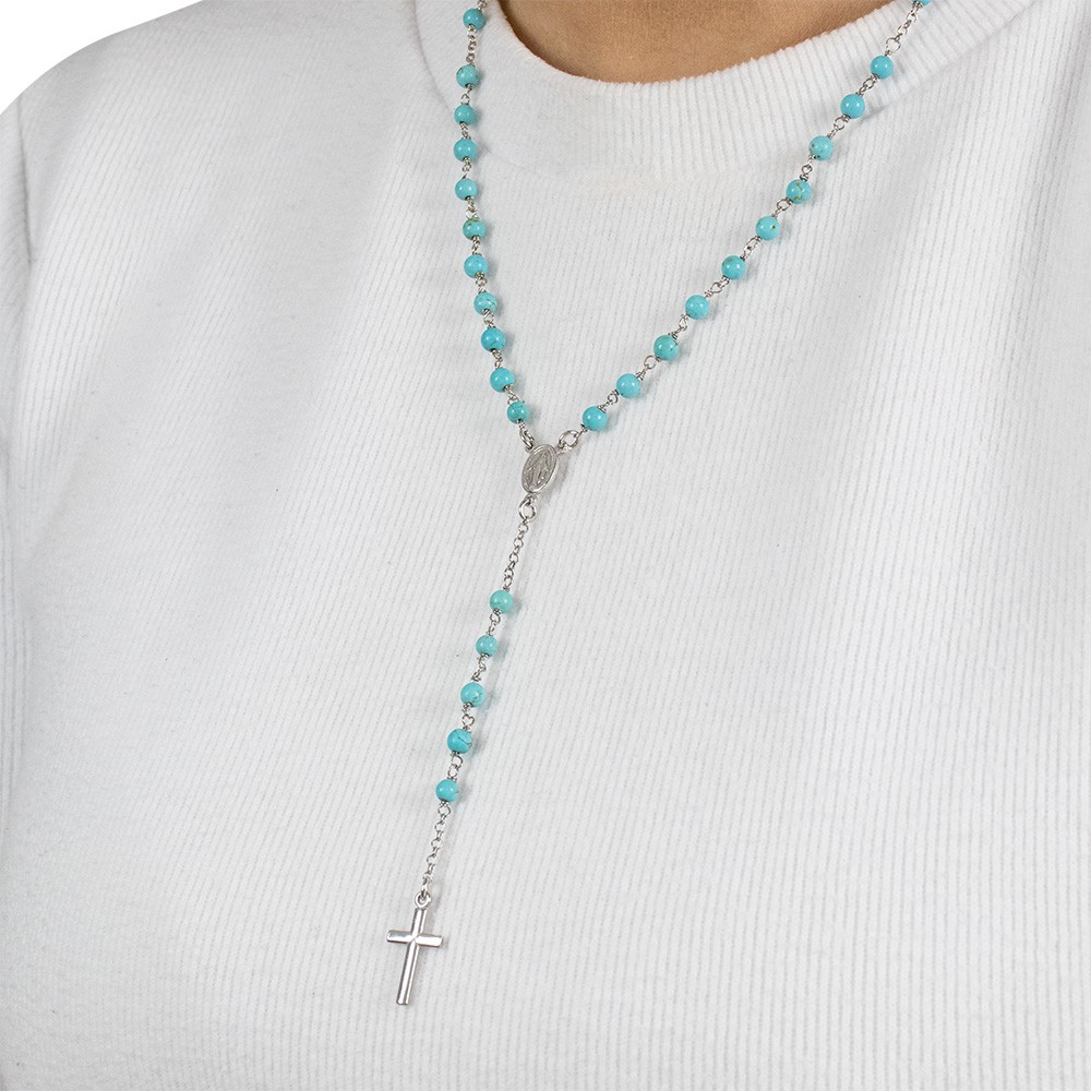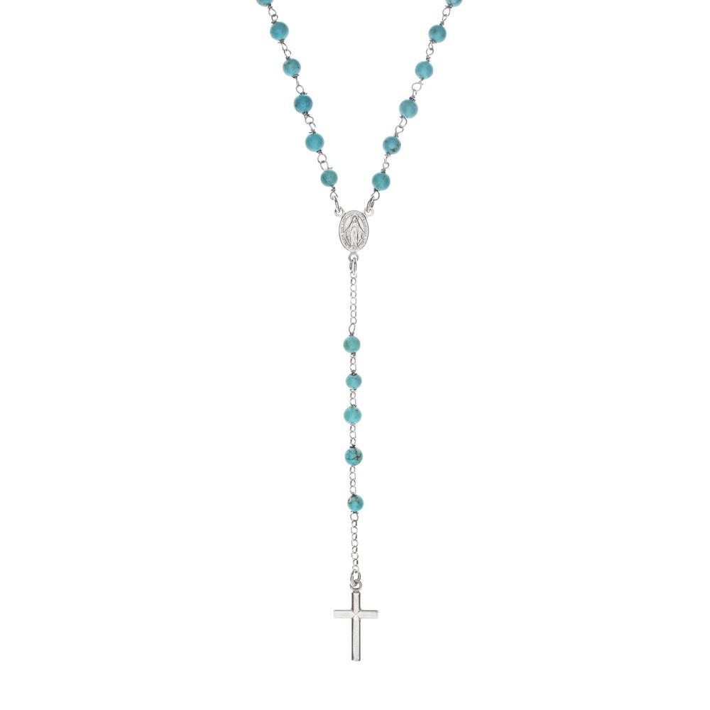 Collana rosario classico da donna in argento rodiato con pietre celesti.