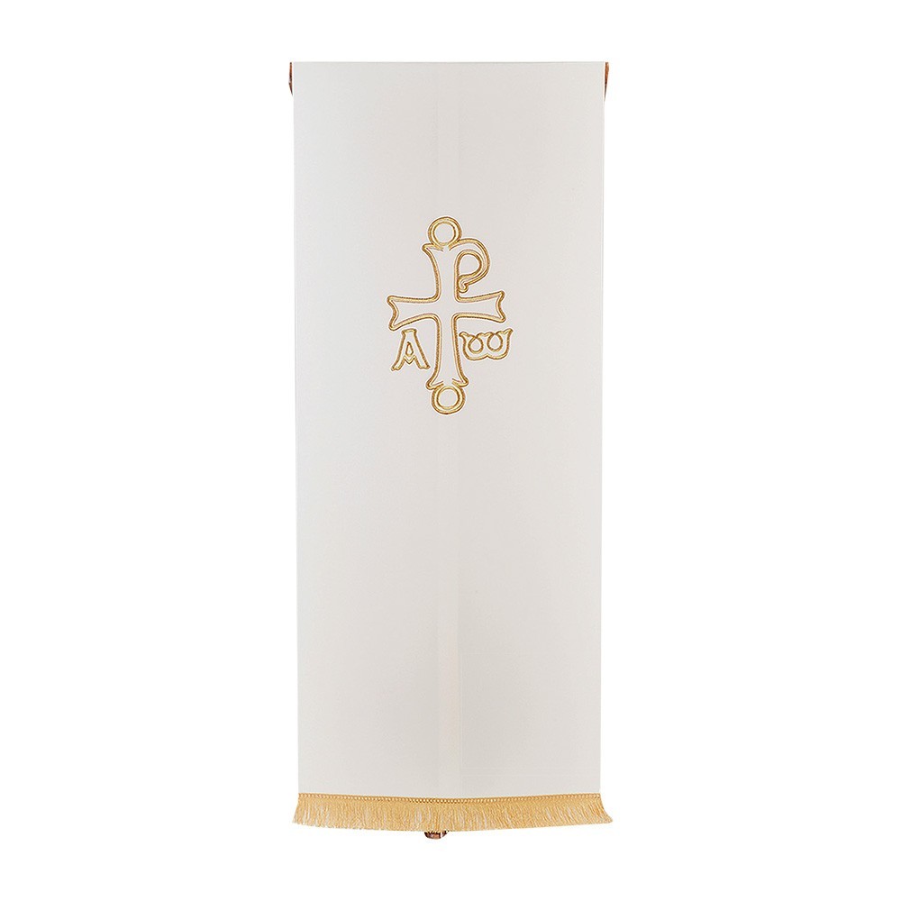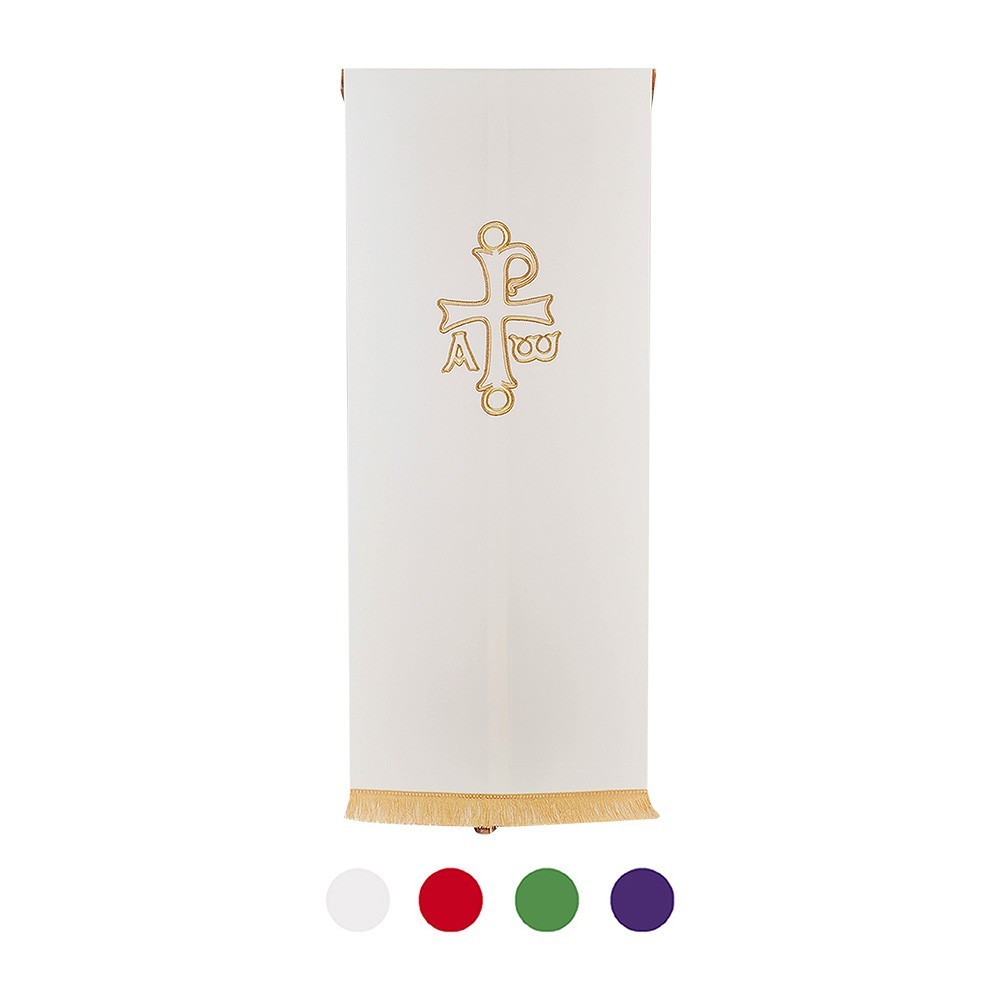 Coprileggio liturgico ricamato e arricchito con frangia color oro. Questo paramento sacro è realizzato in tessuto 100% poliestere.