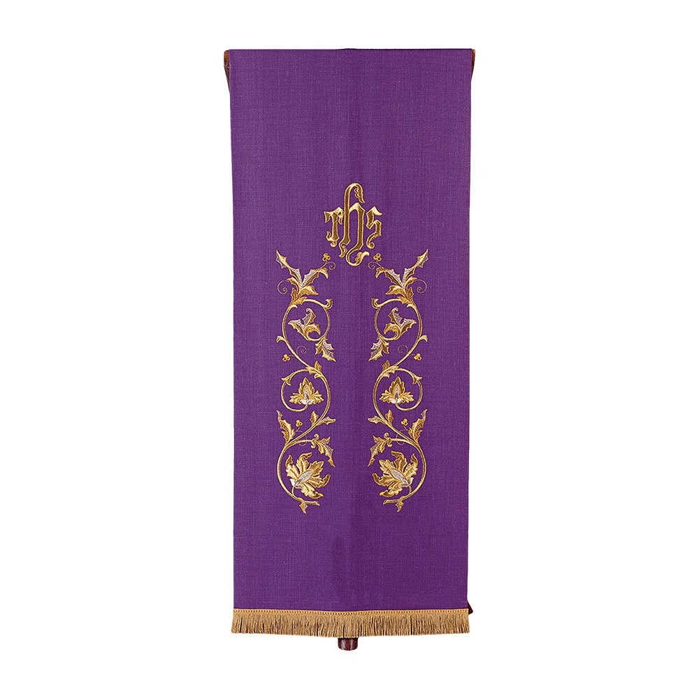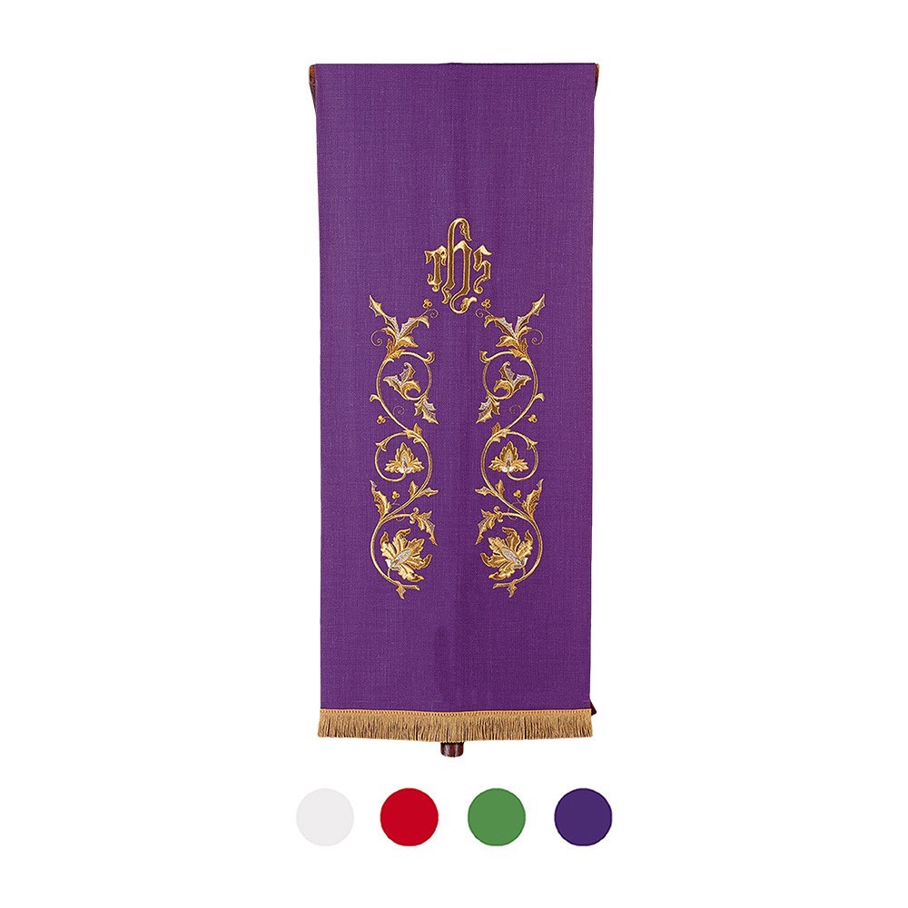 Coprileggio liturgico in misto lana con ricamo JHS. Questo paramento sacro è disponibile nei quatttro colori liturgici ed è realizzato in pregiato tessuto misto lana (55% lana e 45% viscosa).