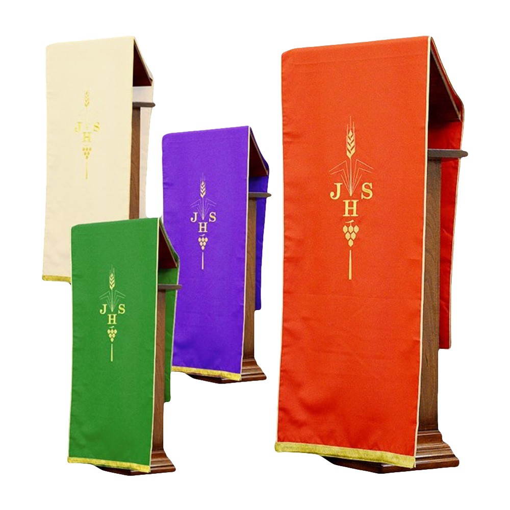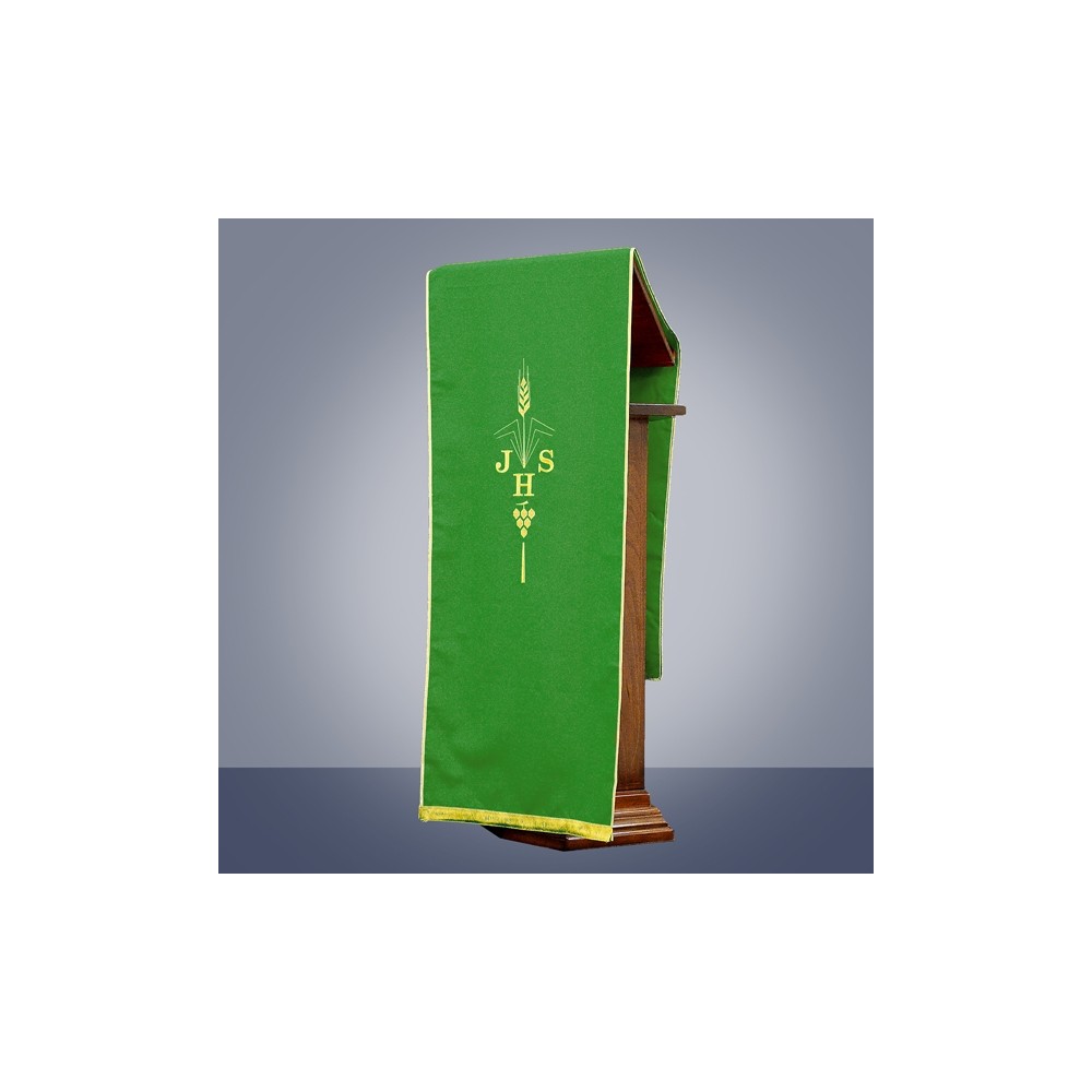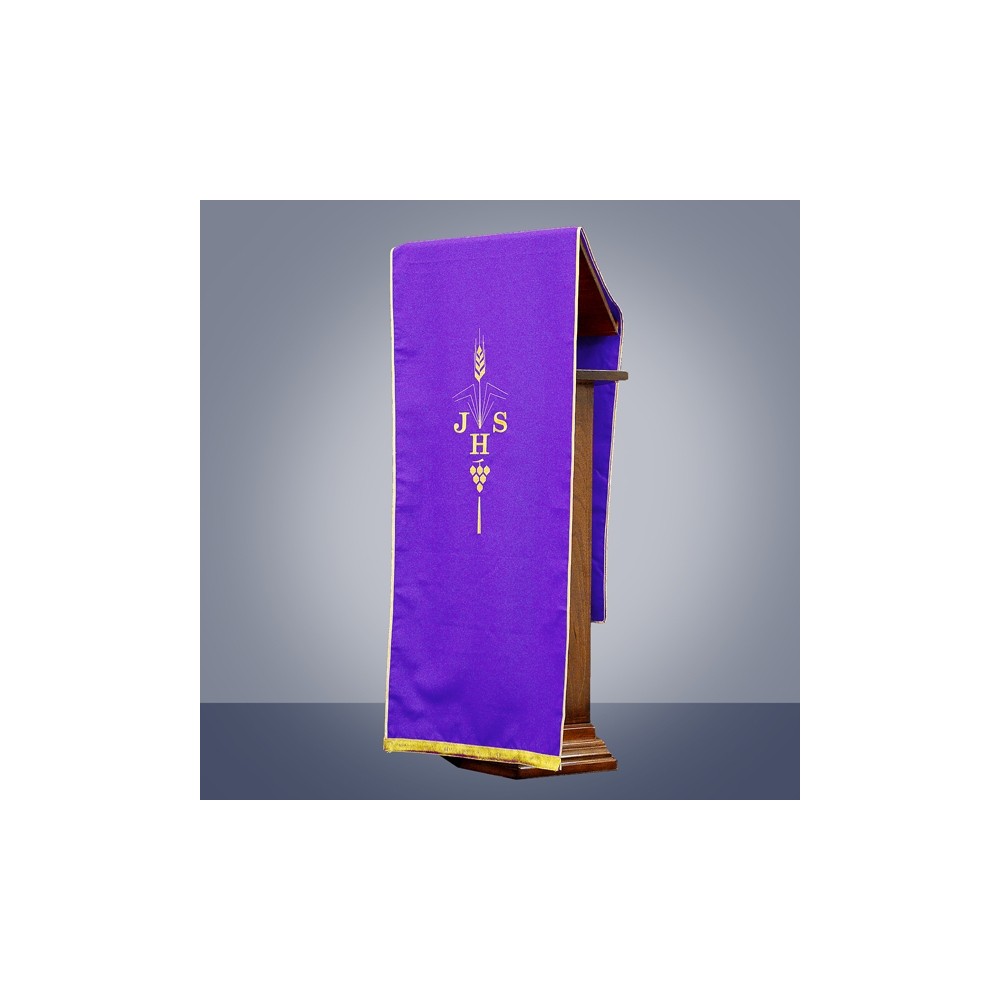 Coprileggio in tessuto poliestere, ricamo realizzato in filo oro (due tonalità di colore) con macchina multiteste. Sul tessuto è ricamato il Cristogramma JHS, l'immagine della spiga e dell'uva. Con frangia sulle due estremità. Disponibili anche gli altri colori liturgici. Made in Italy!