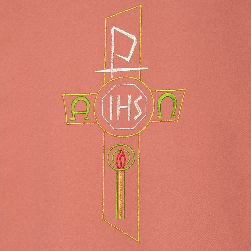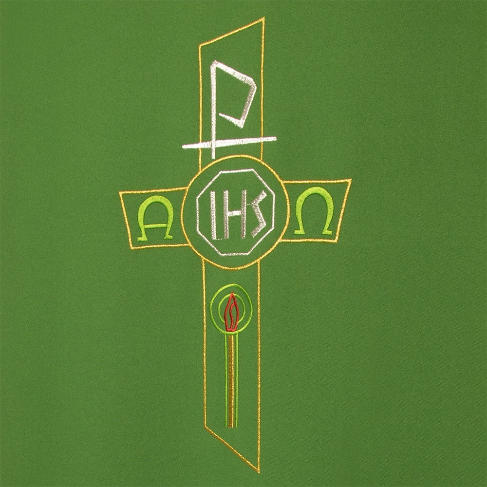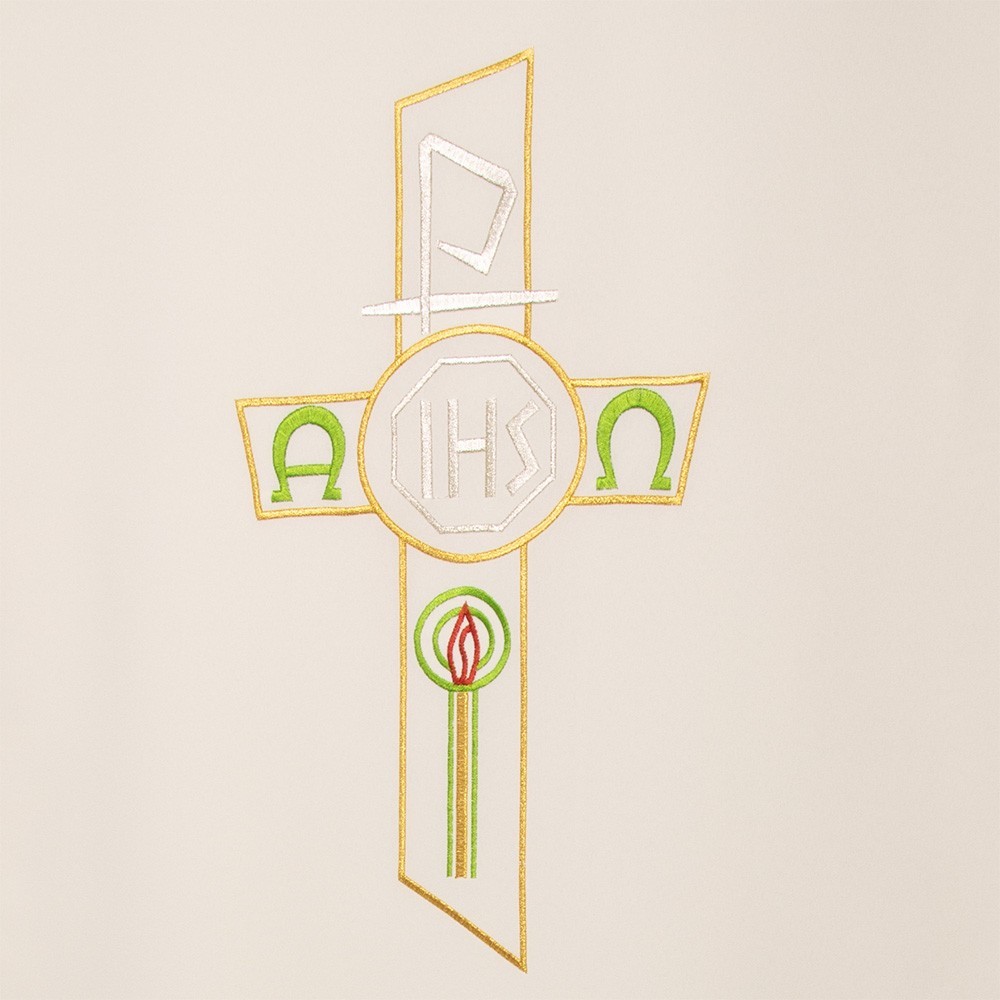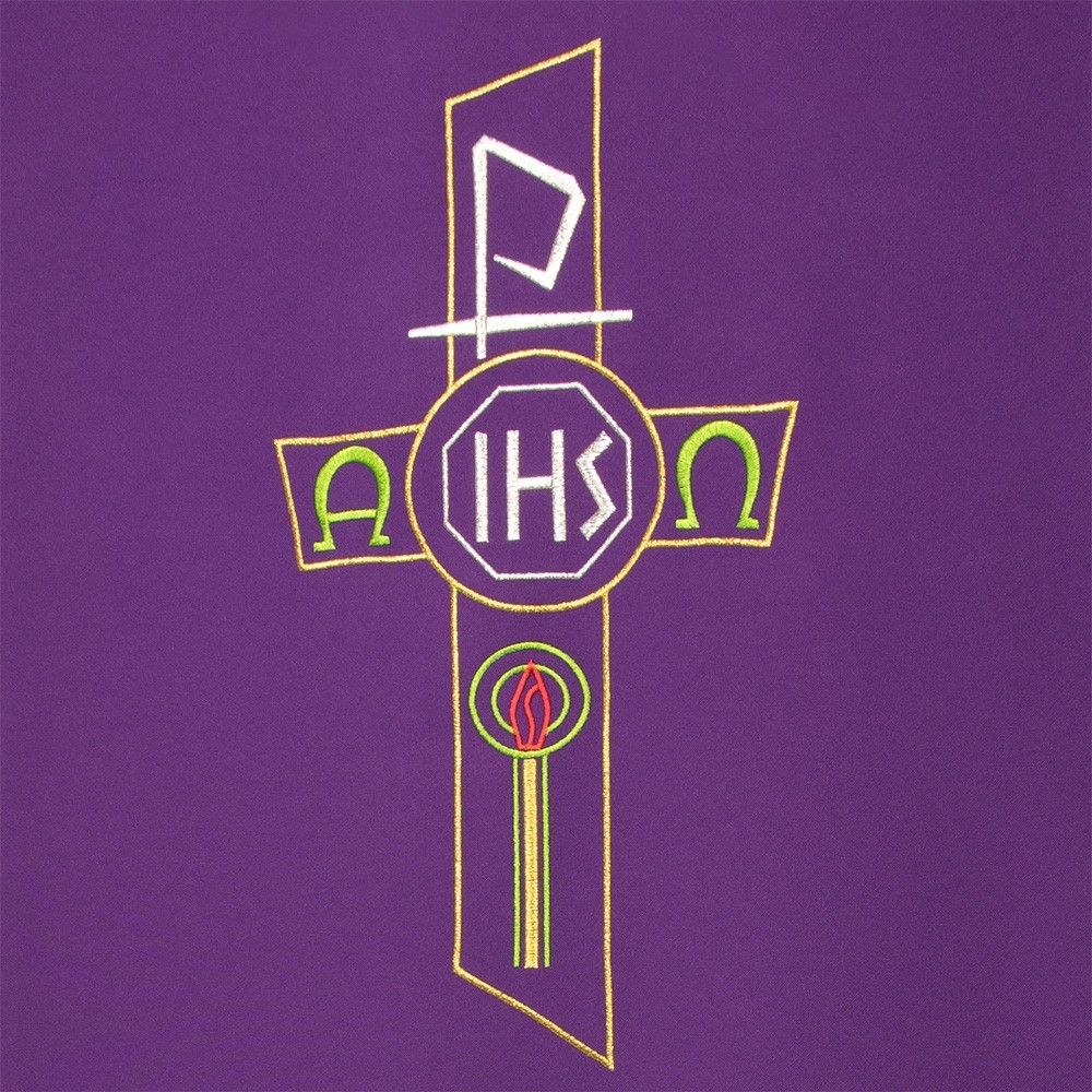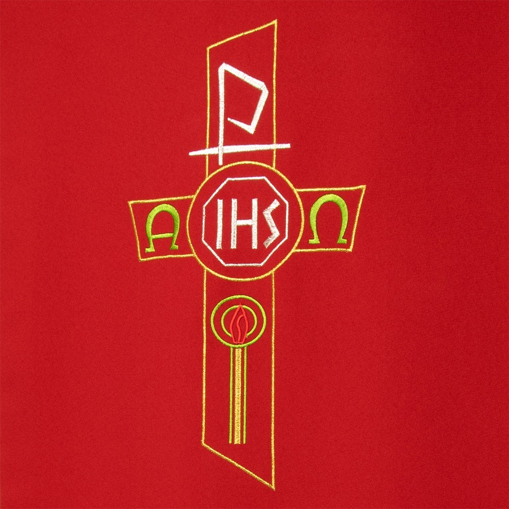 Coprileggio liturgico ricamato raffigurante una croce stilizzata con all'interno i simboli Alfa, Omega, JHS e XP.