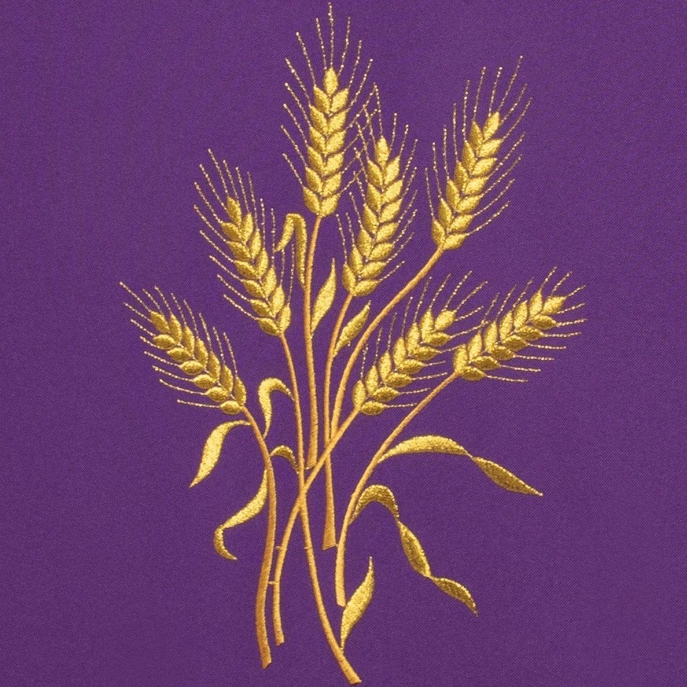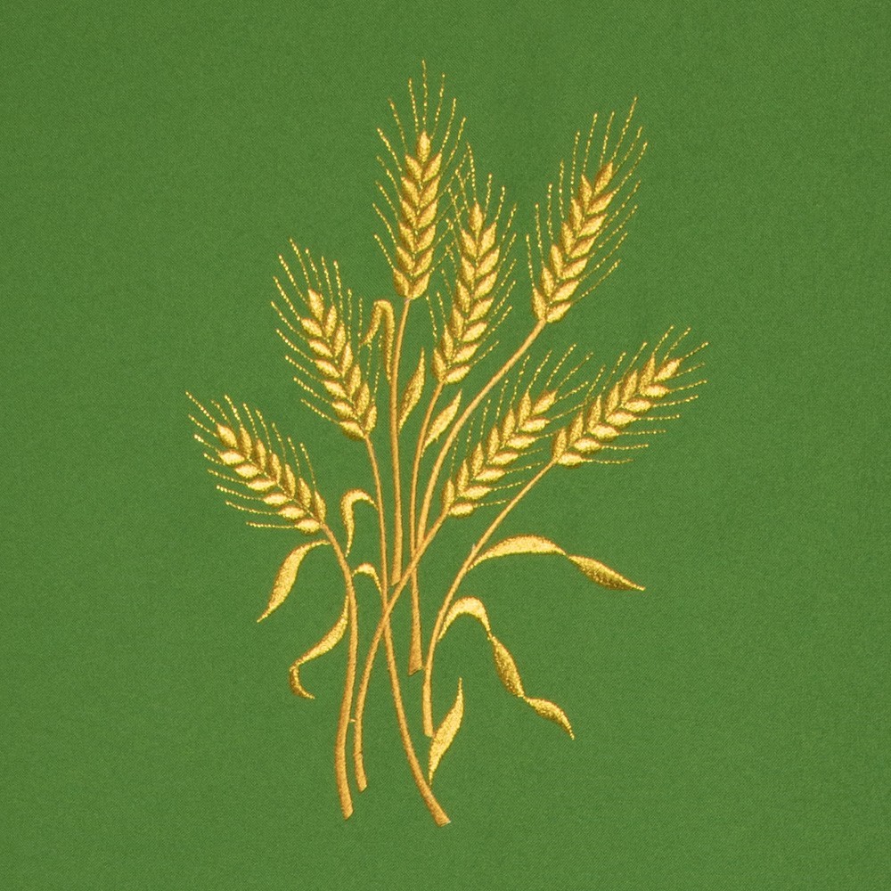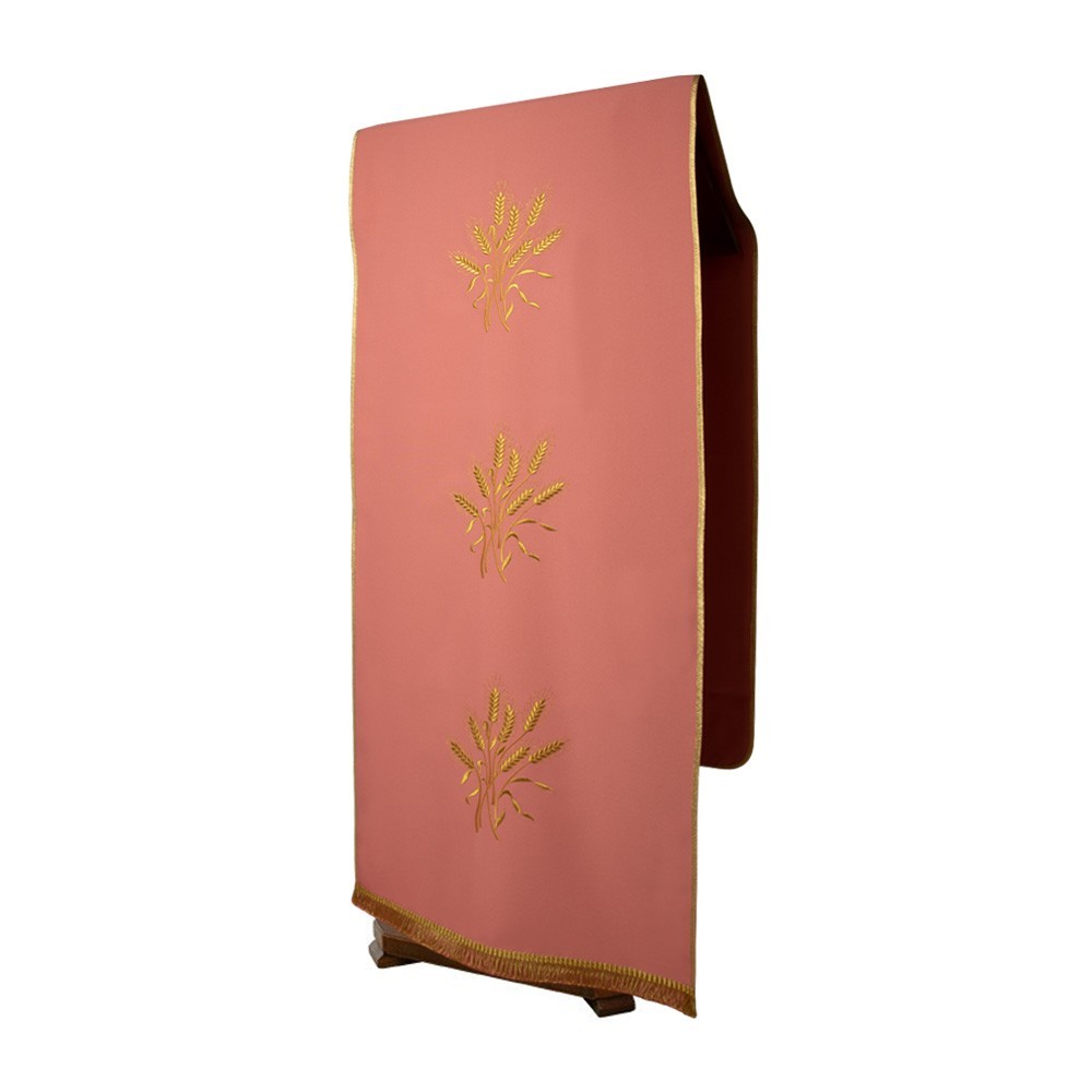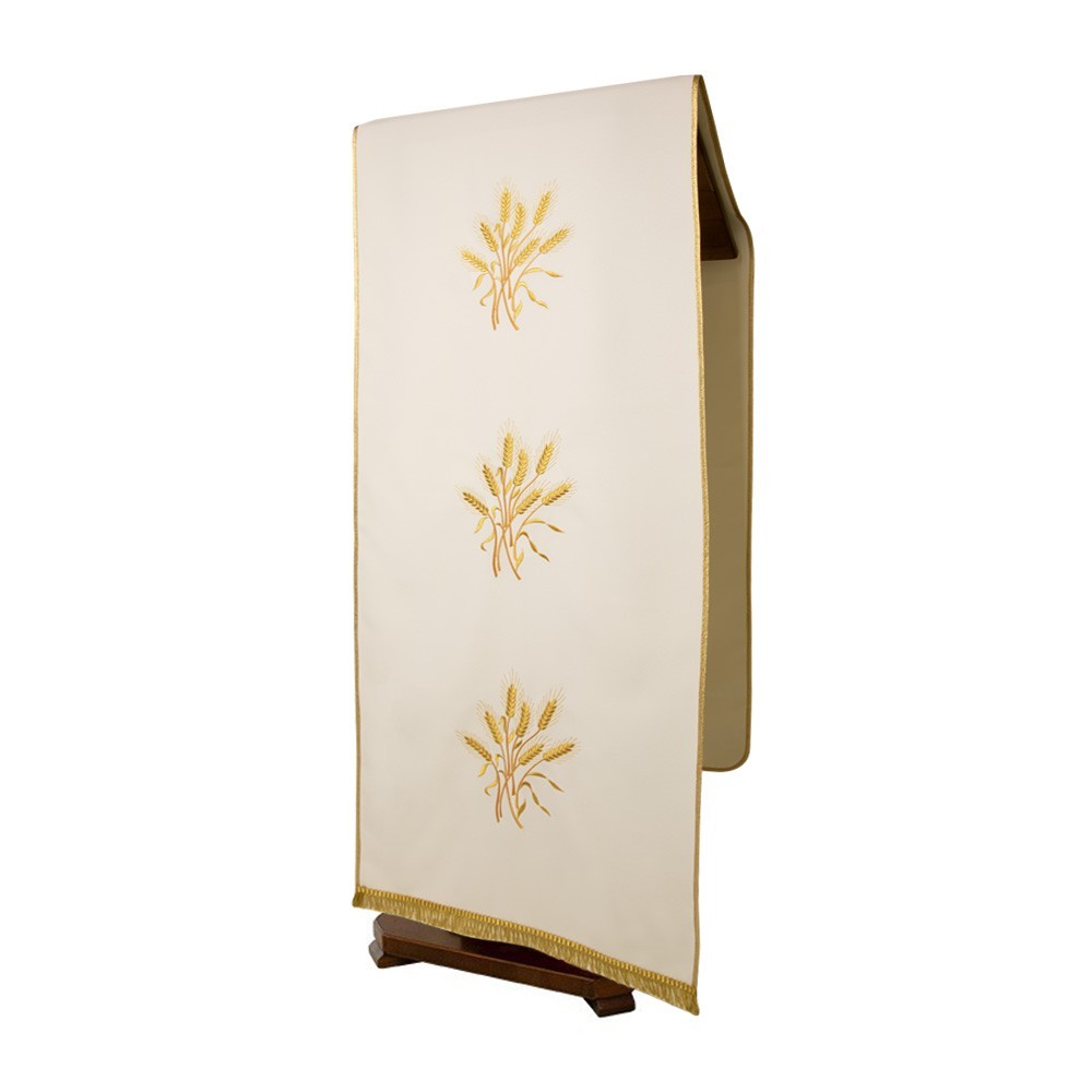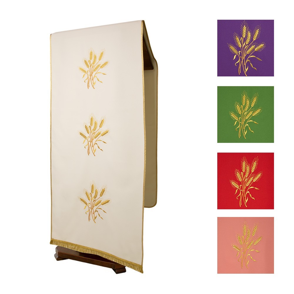Coprileggio realizzato in tessuto poliestere disponibile nei colori liturgici. Questo drappo è usato per coprire e ornare il leggio in chiesa, si presenta con tre spighe ricamate, con sbieco e frangia dorata.