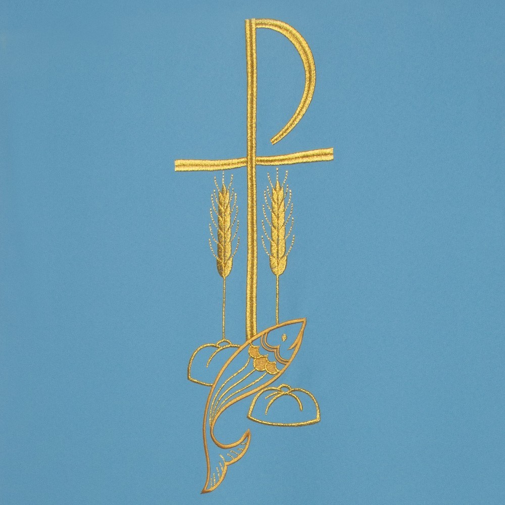 Coprileggio liturgico azzurro in tessuto poliestere. Rifinito con frangia sulle due estremità e sbieco dorato. Made in Italy!