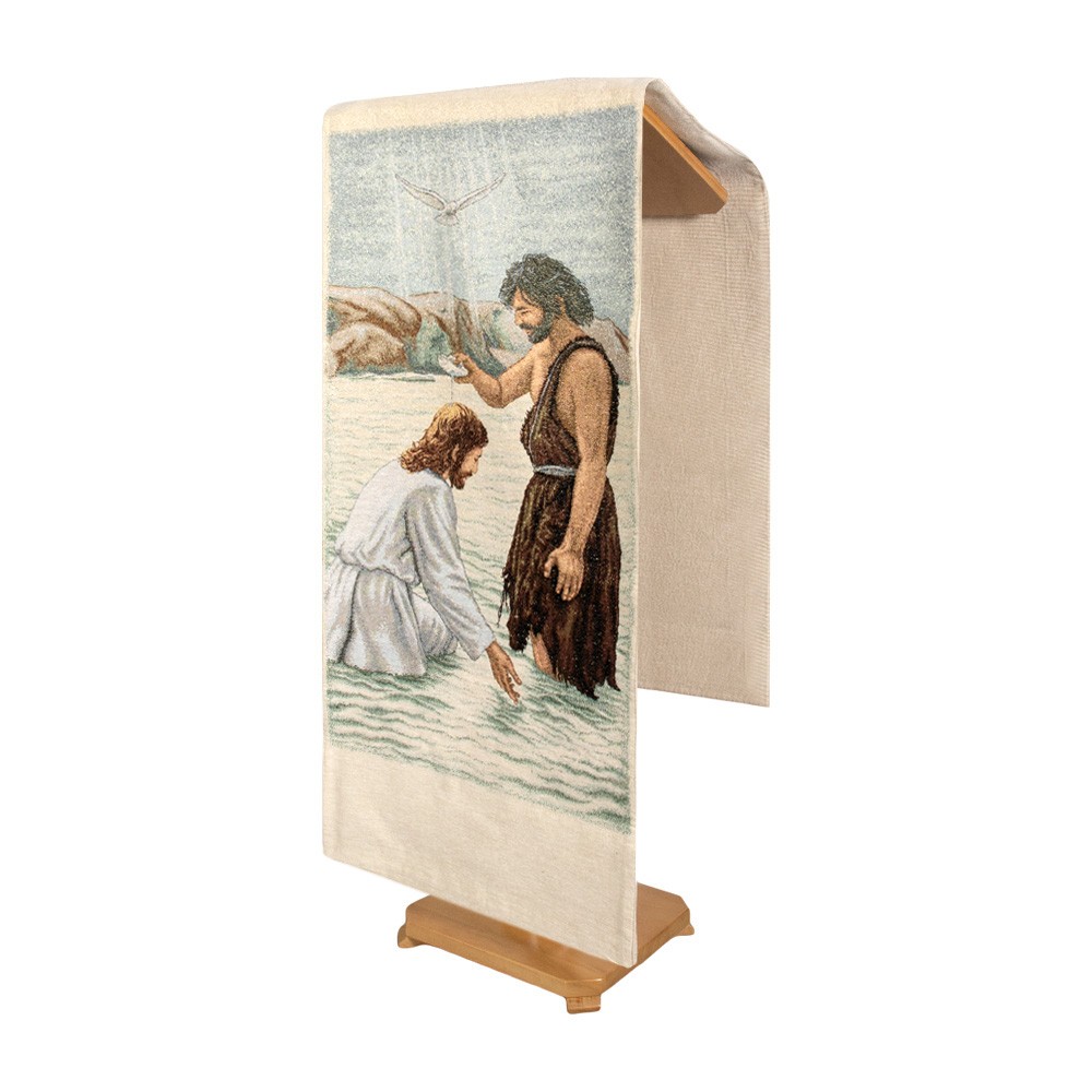 Coprileggio ricamato con immagine raffigurata del Battesimo di Gesù, su sfondo celeste e lavorazione lurex.