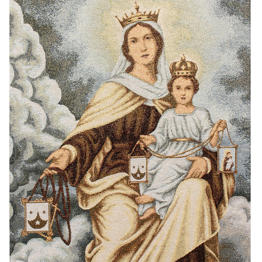 Il copri ambone o coprileggio è realizzato con lavorazione artigianale a telaio jacquard su fondo avorio raffigurante la Madonna del Carmine.