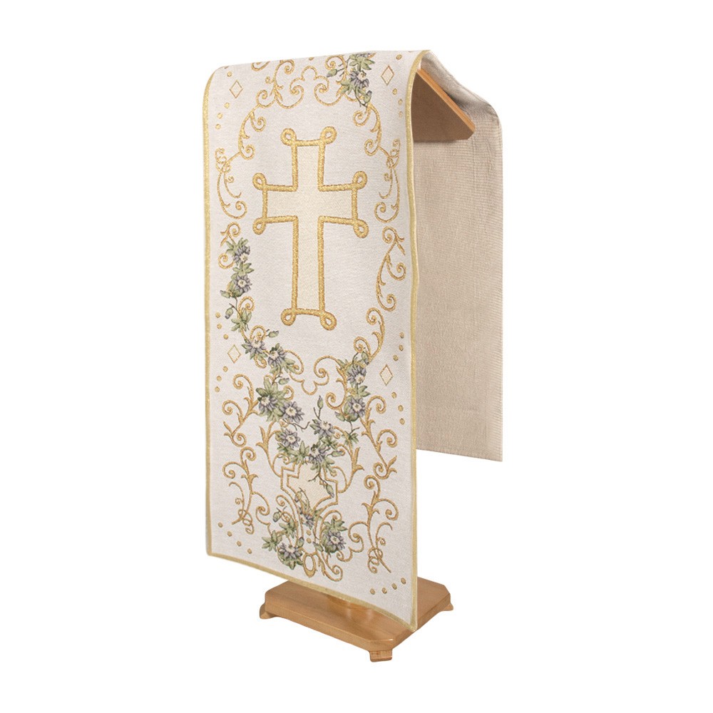 Copri ambone o coprileggio avorio con croce ricamata e decori floreali, lavorazione artigianale a telaio su fondo chiaro.