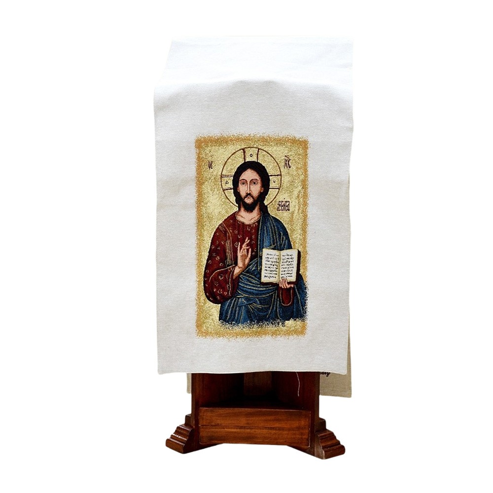 Copri leggio con immagine ricamata di Gesù Pantocratore. Questo copri ambone è in tessuto lana lurex, ideale per solennizzare la Parola di Dio.