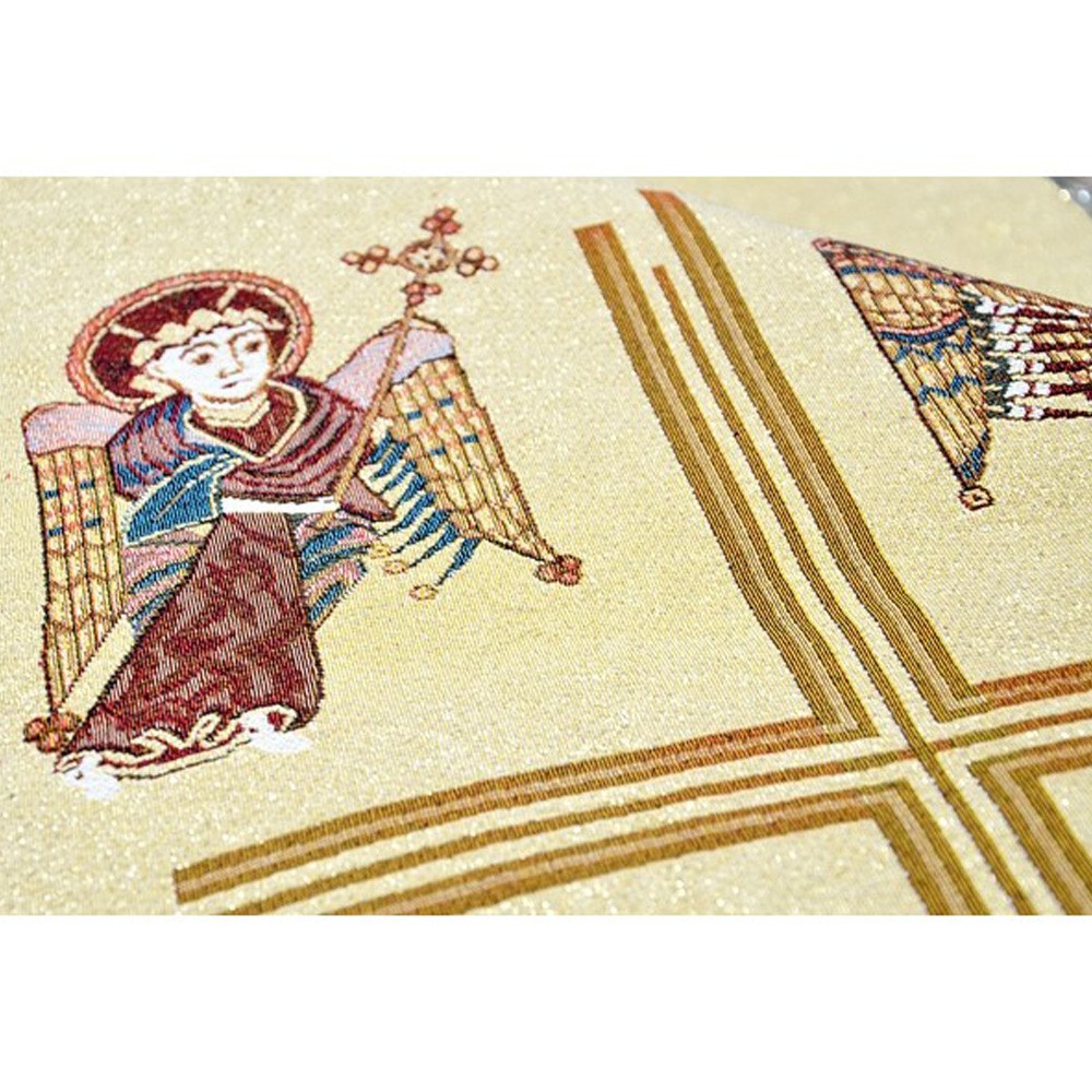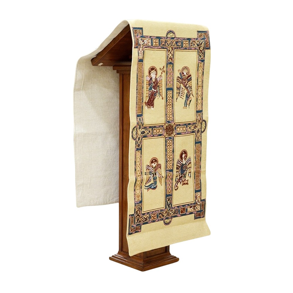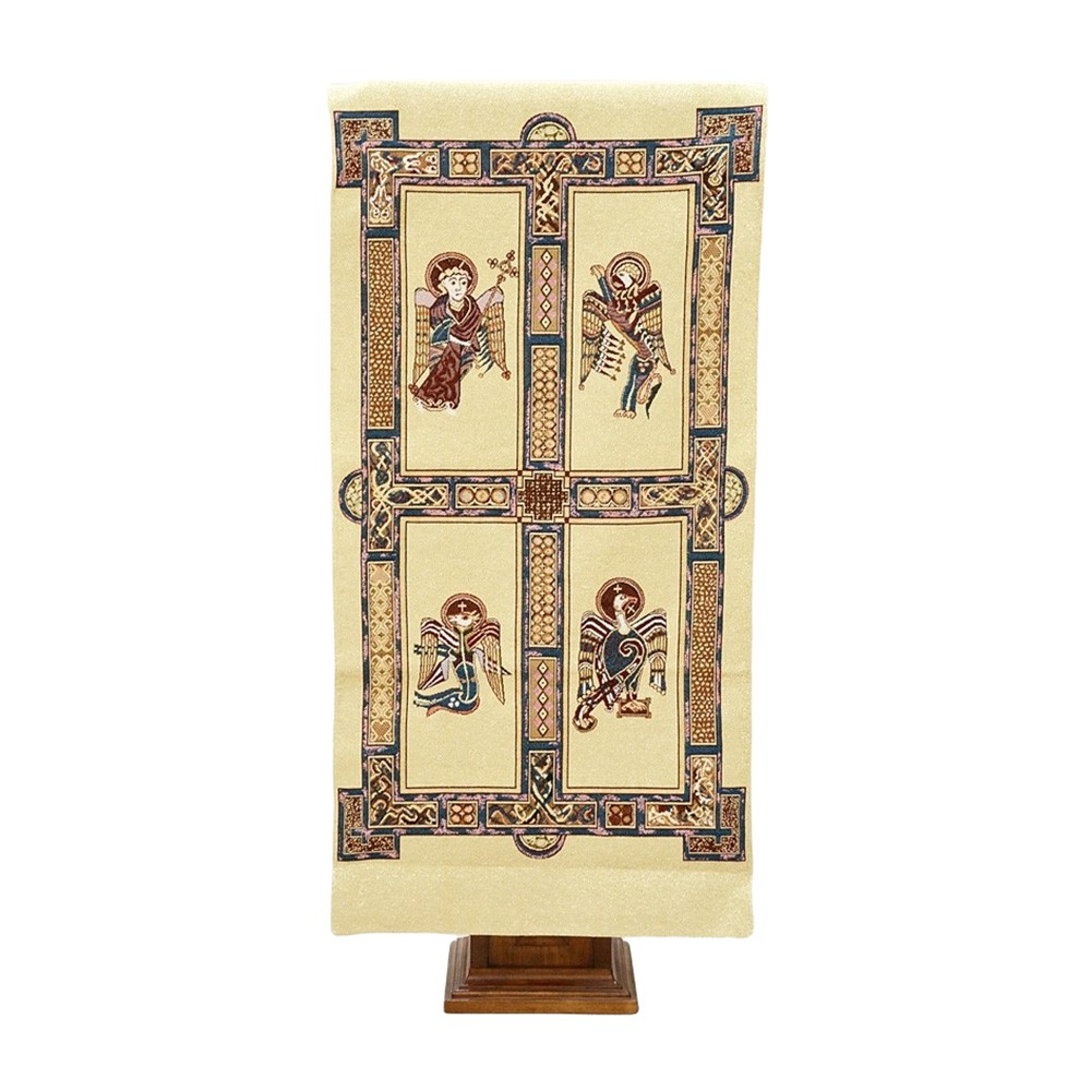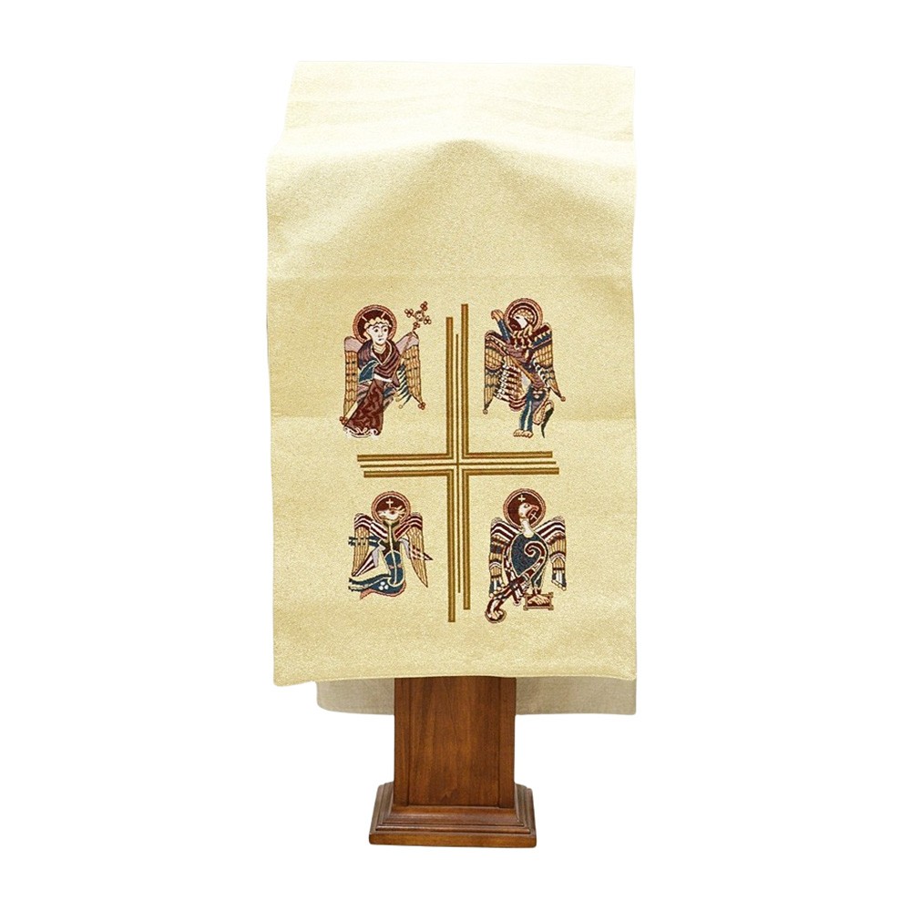 Copri leggio con immagine tessuto su tessuto, raffigurante i simboli dei Quattro Evangelisti. Questo copri ambone è in tessuto lana lurex, ideale per intronizzare la Parola di Dio.