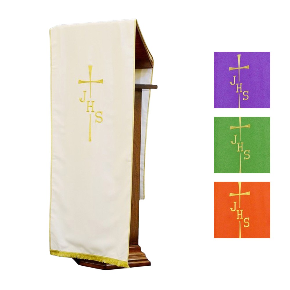 Coprileggio in tessuto poliestere con ricamo JHS e una grande Croce stilizzata. Con frangia sulle due estremità e bordo dorato ai lati. Ottimo rapporto qualità/prezzo. Articolo molto elegante, adatto per arredare il leggio in Chiesa.