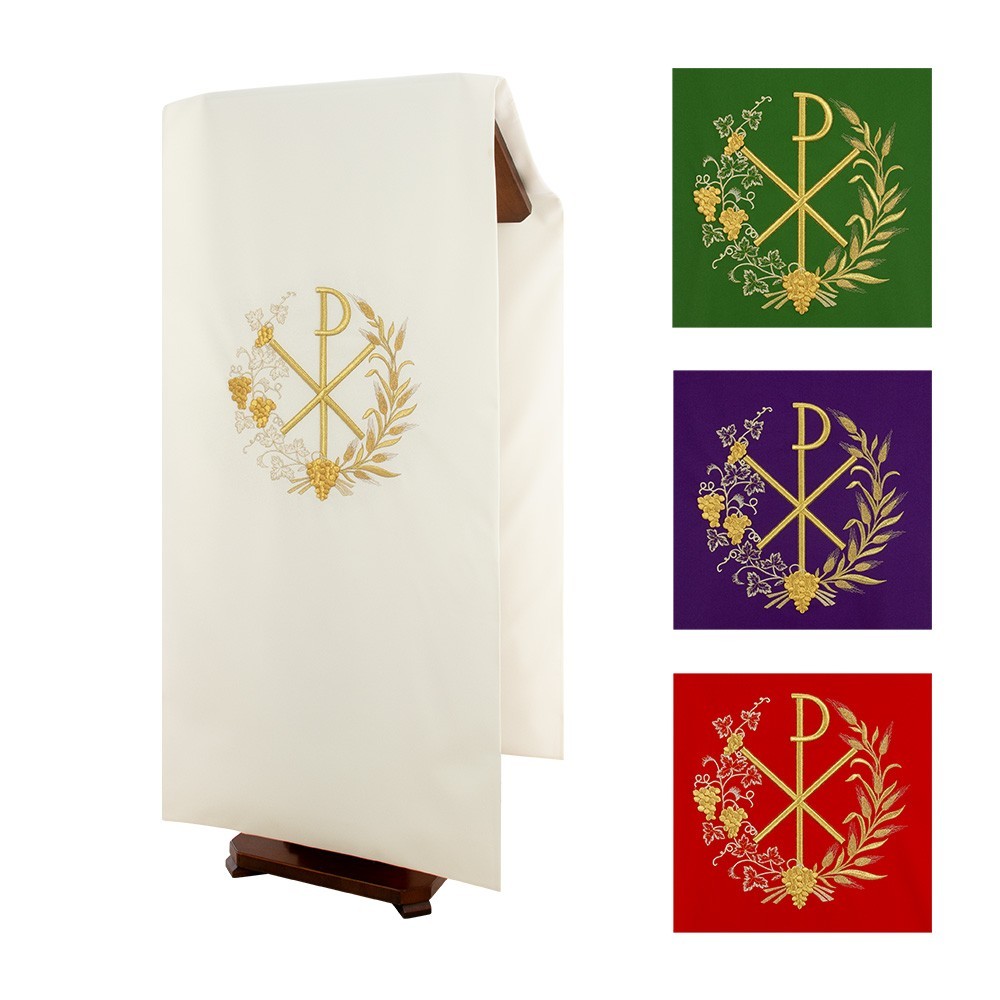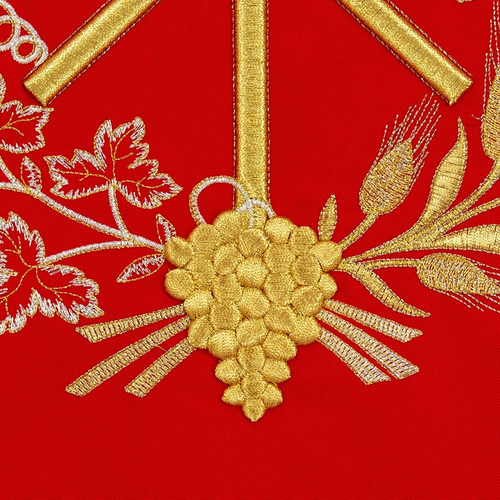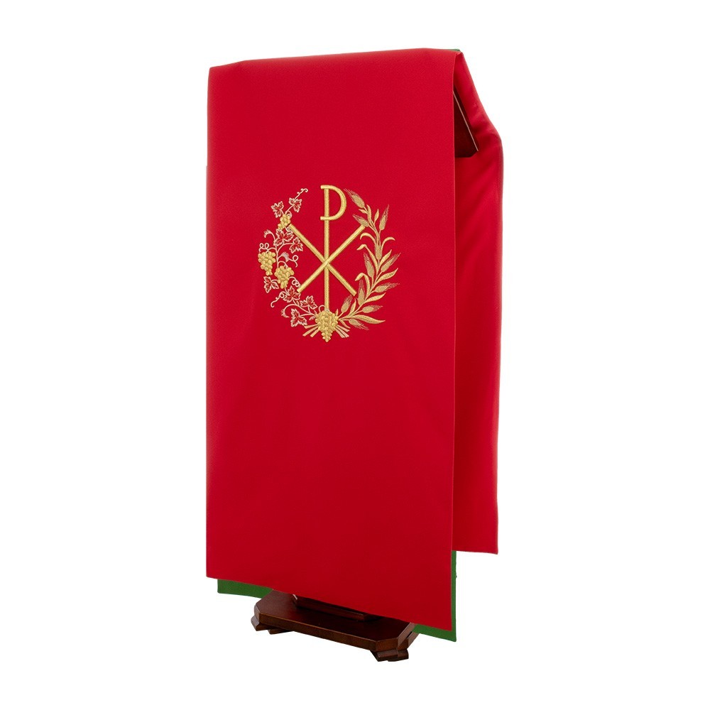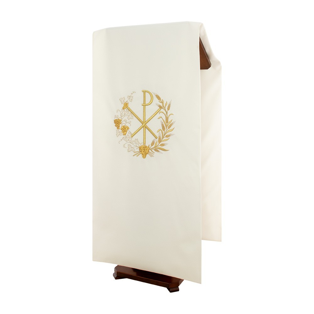 Coprileggio con ricami in oro che raffigurano il simbolo PAX circondato da grappoli d'uva e spighe. Confezionato in leggero e resistente tessuto poliestere.
