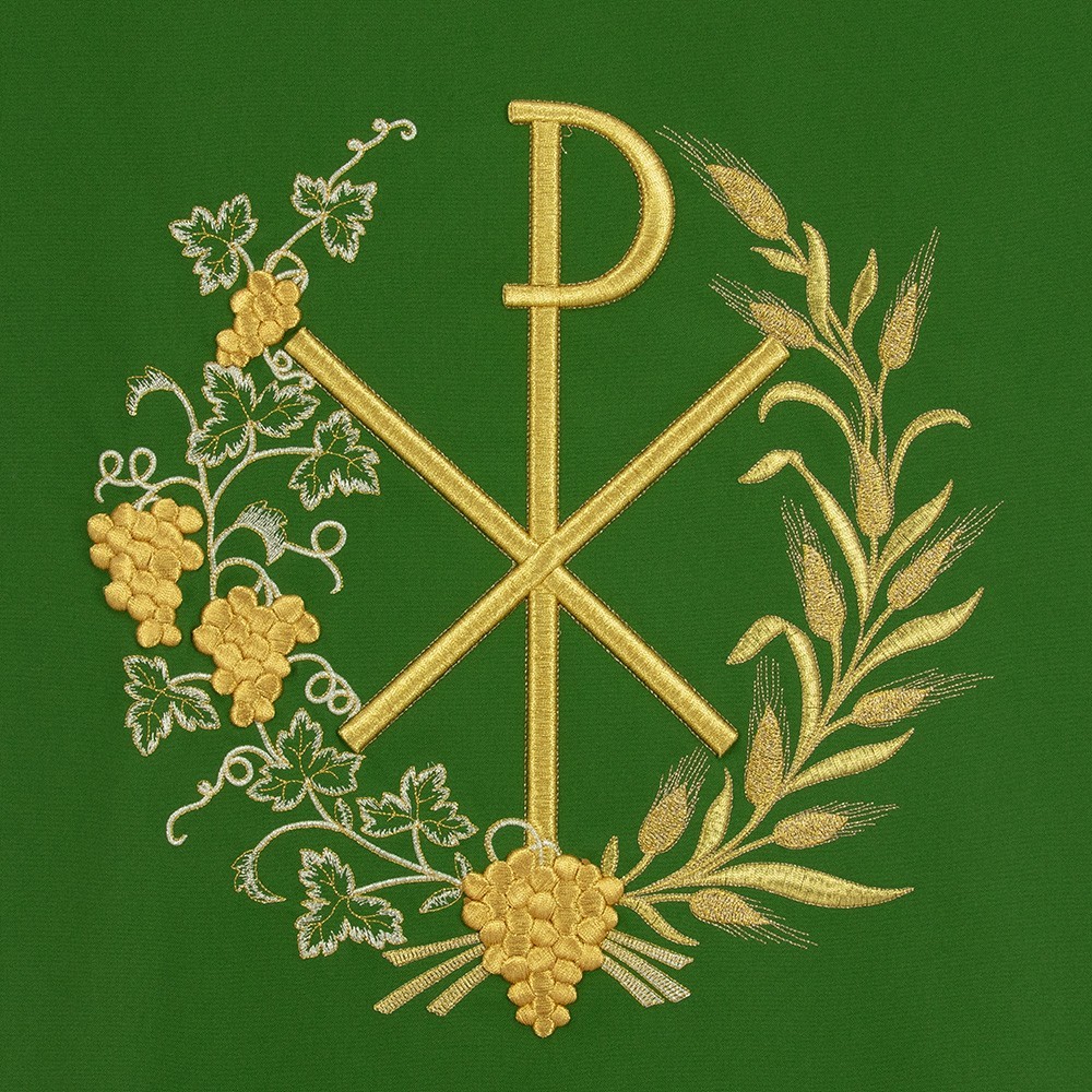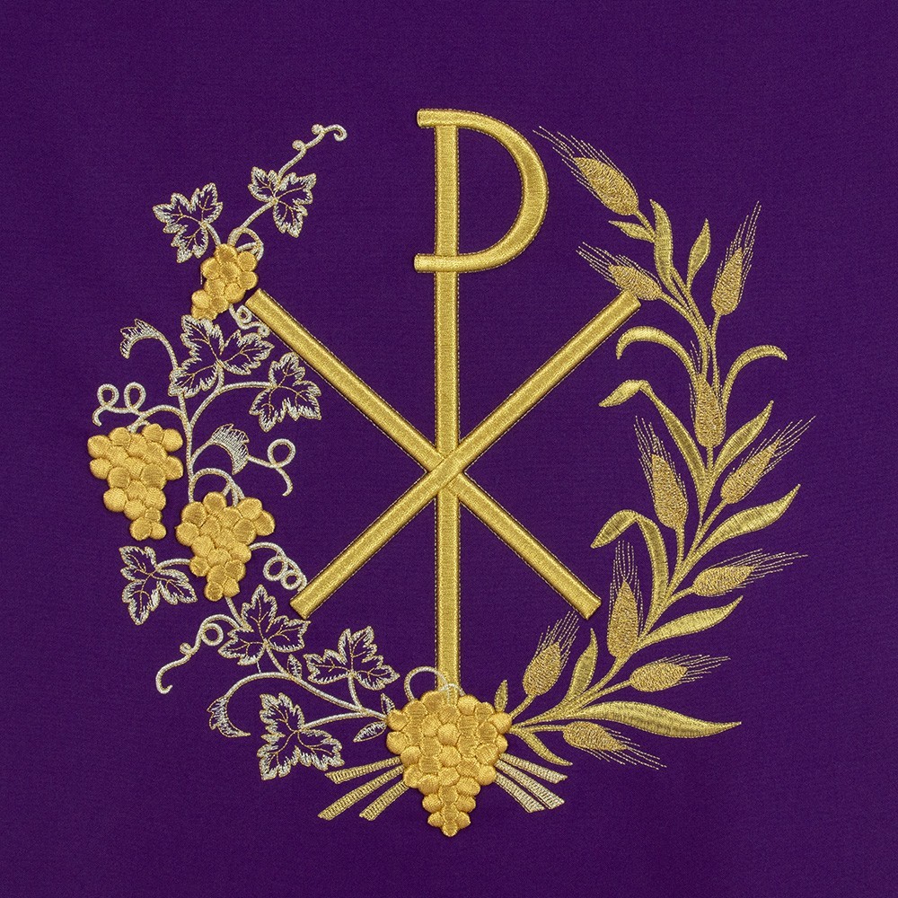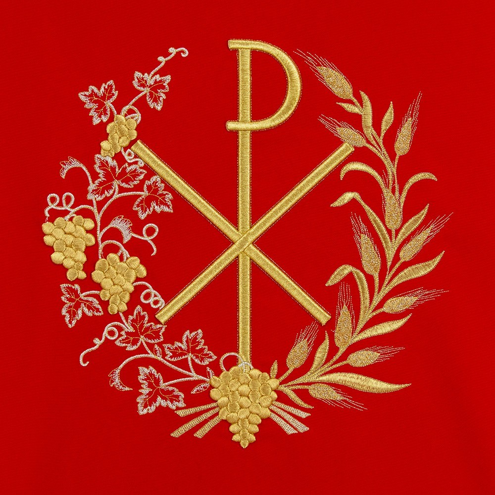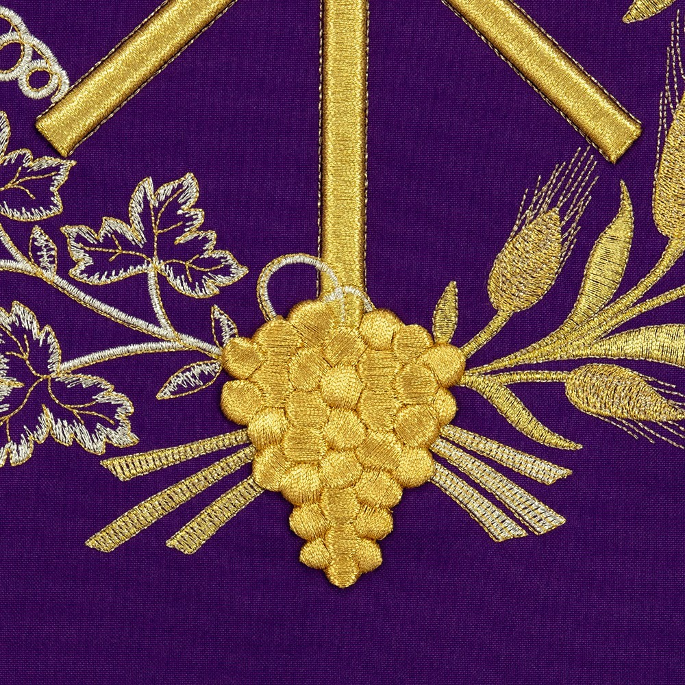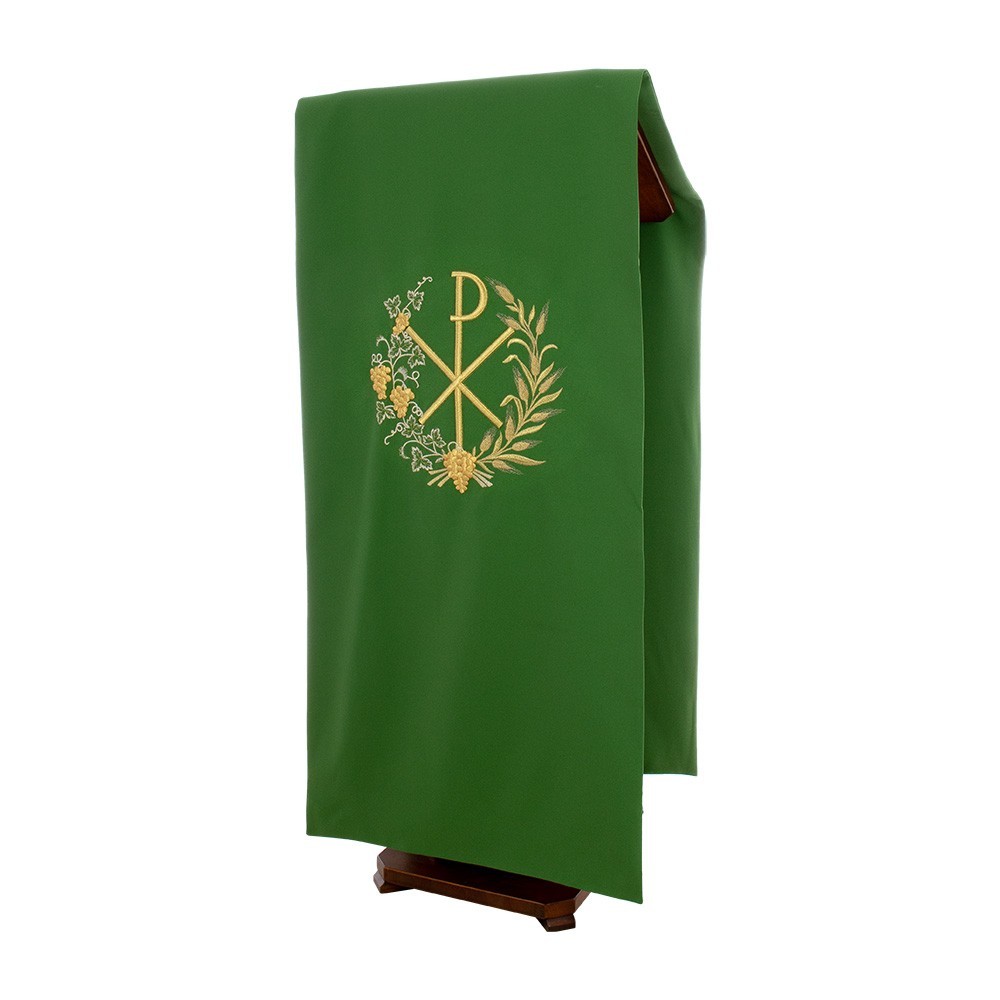 Coprileggio con ricami in oro che raffigurano il simbolo PAX circondato da grappoli d'uva e spighe. Confezionato in leggero e resistente tessuto poliestere.