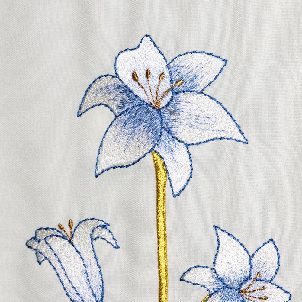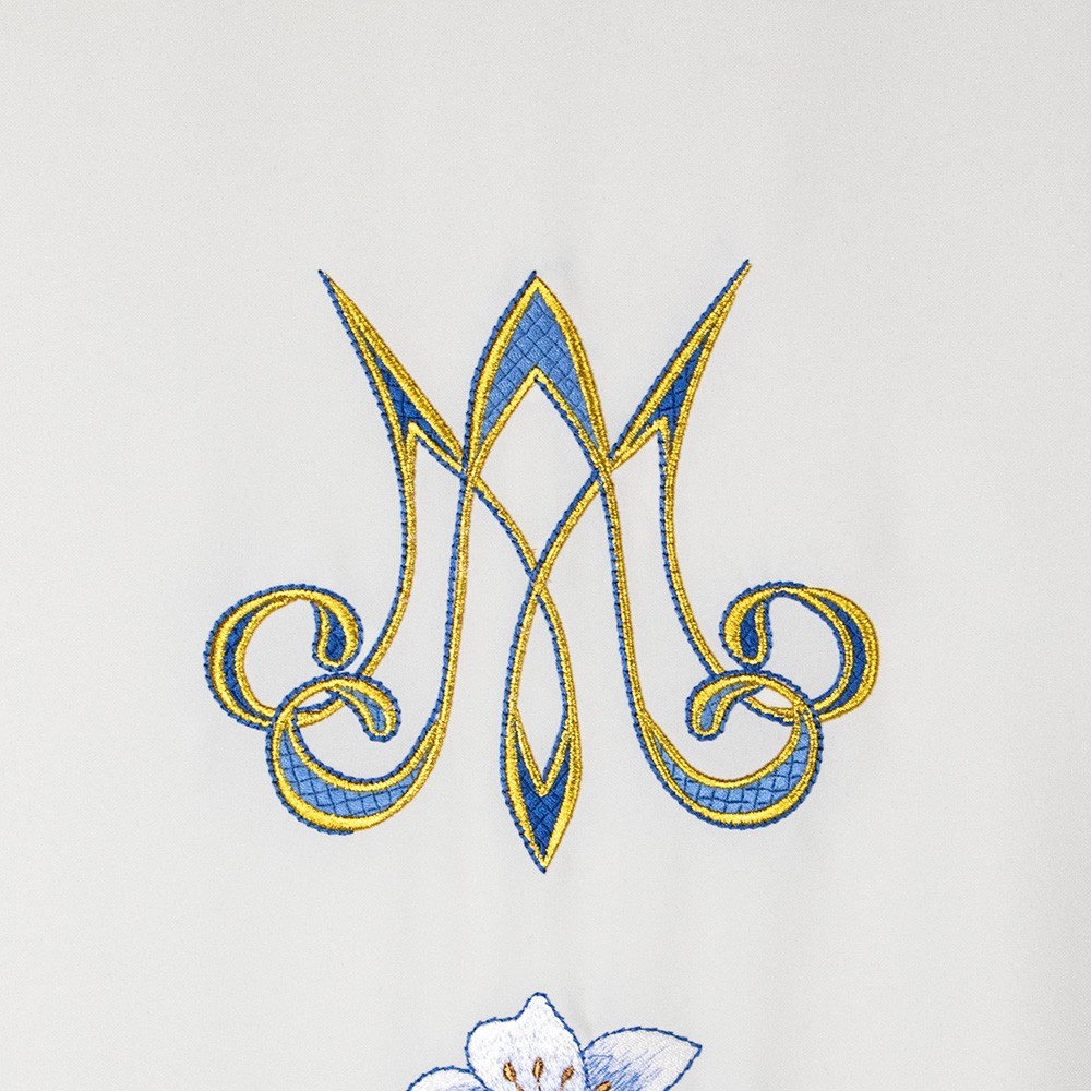 Copri leggio ricamato con monogramma Mariano. Questo paramento sacro è in leggero tessuto 100% poliestere con decoro mariano e filati azzurro, argento e oro. I ricami vengono utilizzati con macchine di altissima qualità.