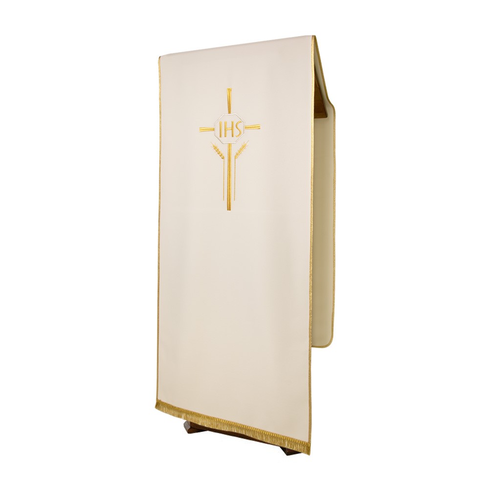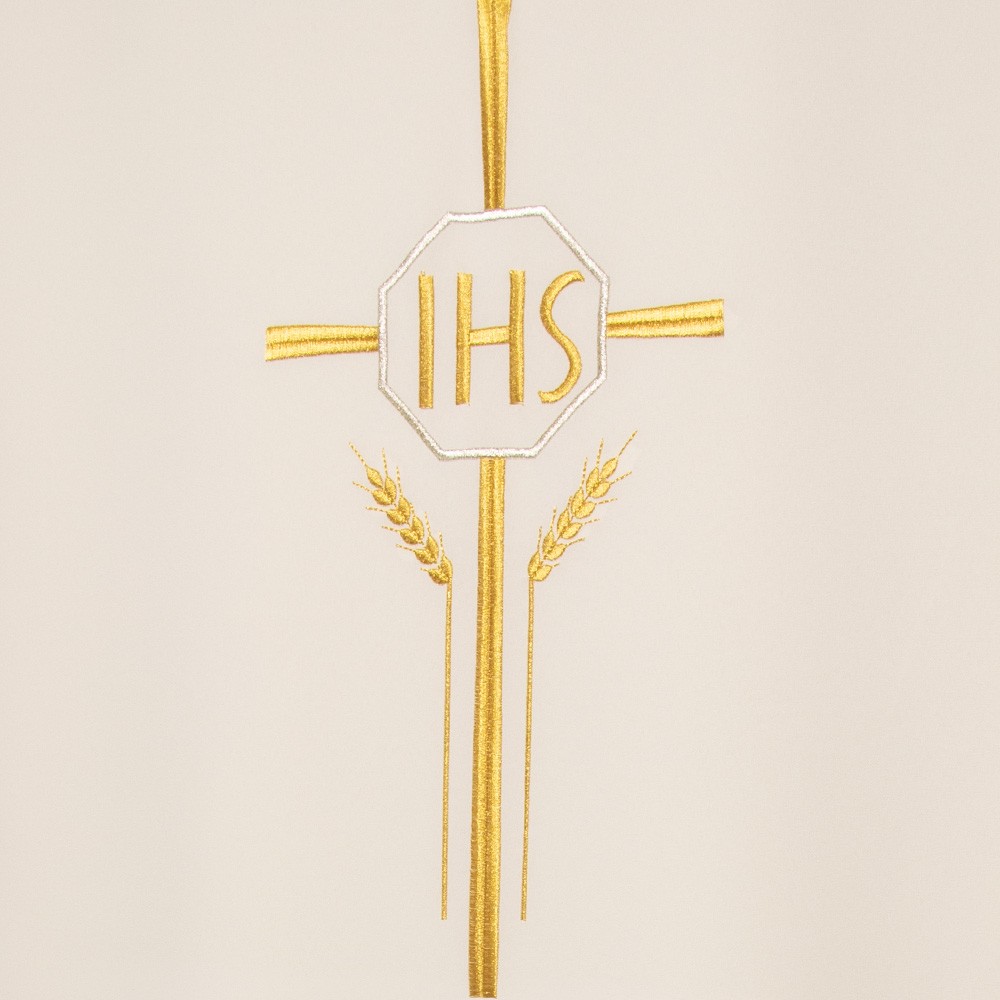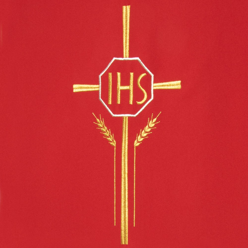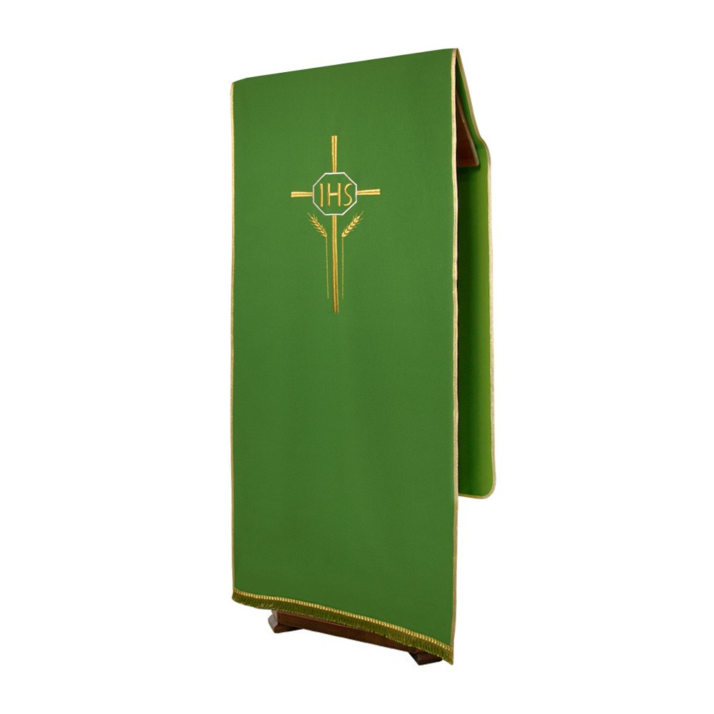 Il ricamo raffigura una croce stilizzata con al centro il simbolo JHS e due spighe laterali. Questo copri leggio o copri ambone è realizzato in tessuto 100% poliestere. Produzione made in Italy.