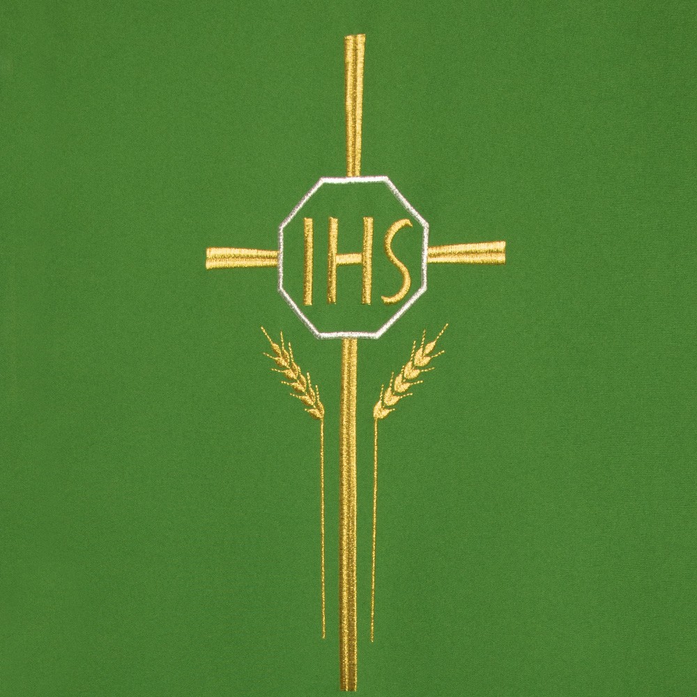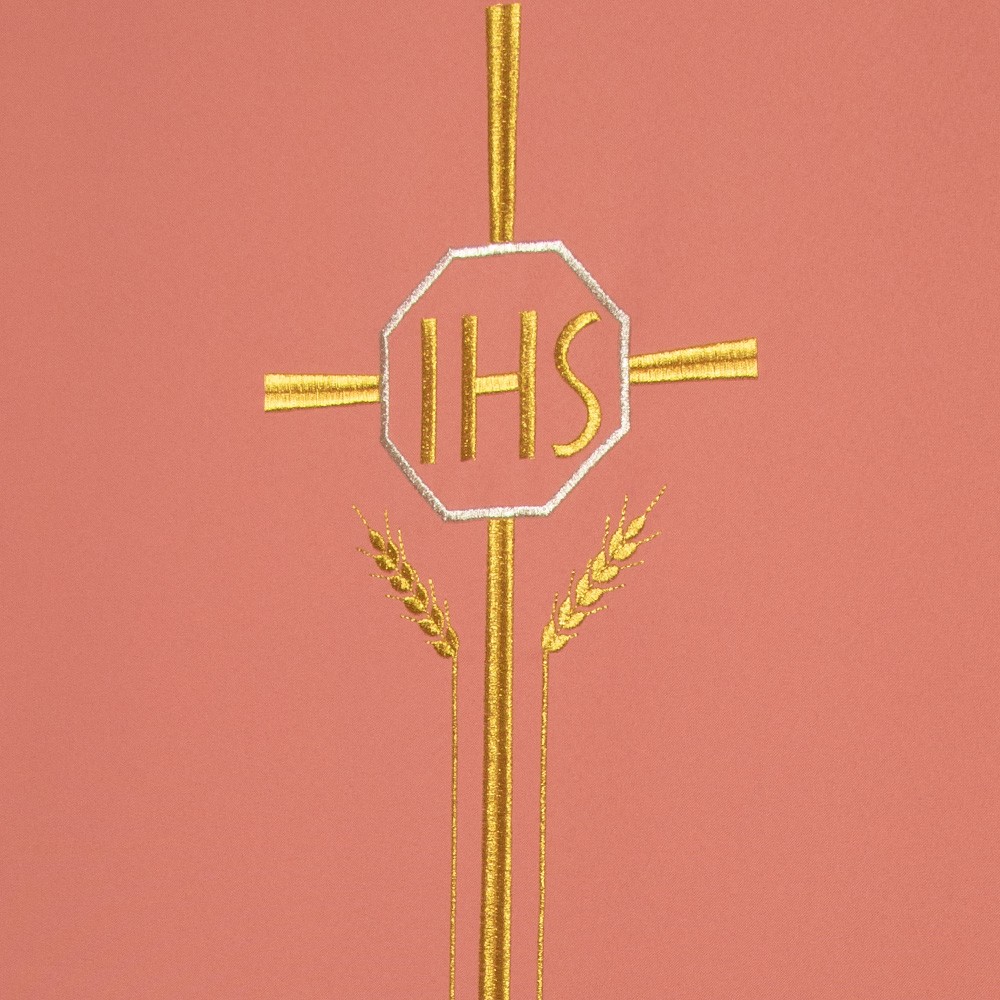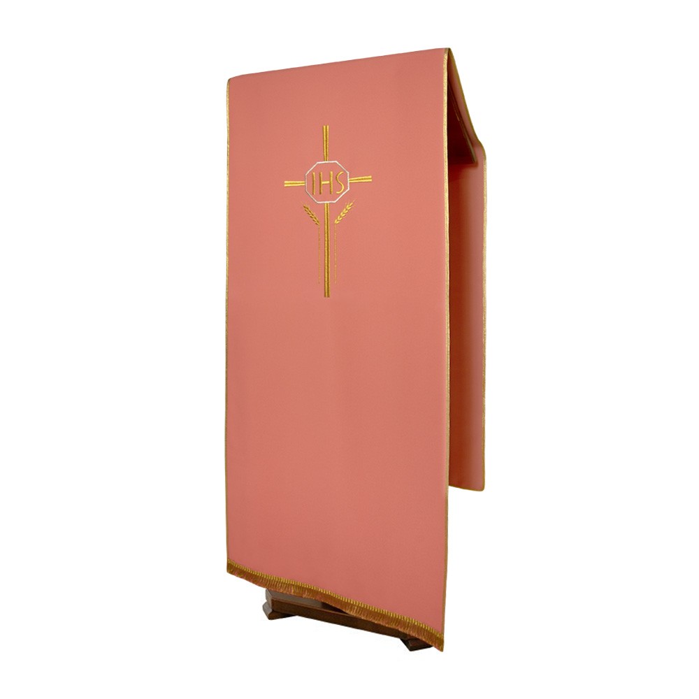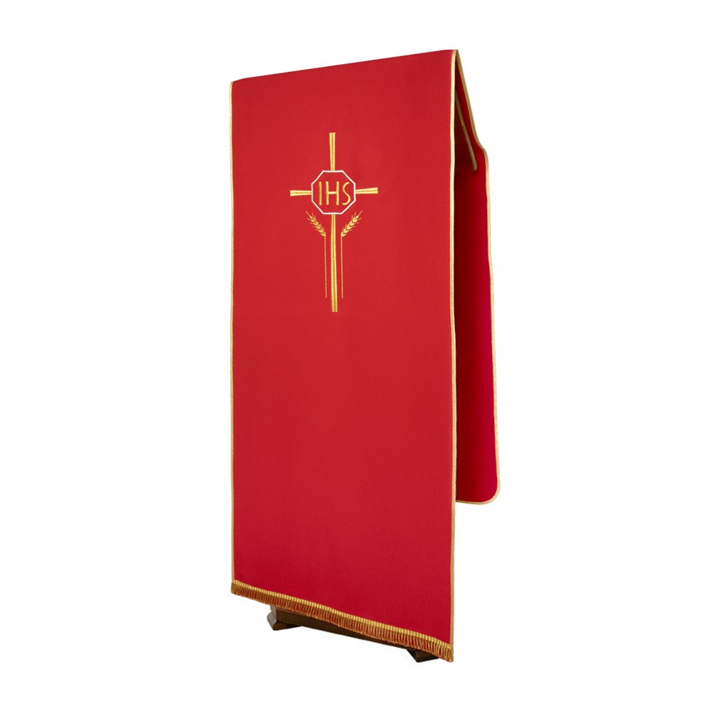 Il ricamo raffigura una croce stilizzata con al centro il simbolo JHS e due spighe laterali. Questo copri leggio o copri ambone è realizzato in tessuto 100% poliestere. Produzione made in Italy.