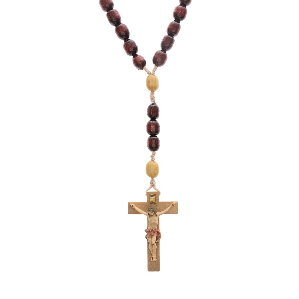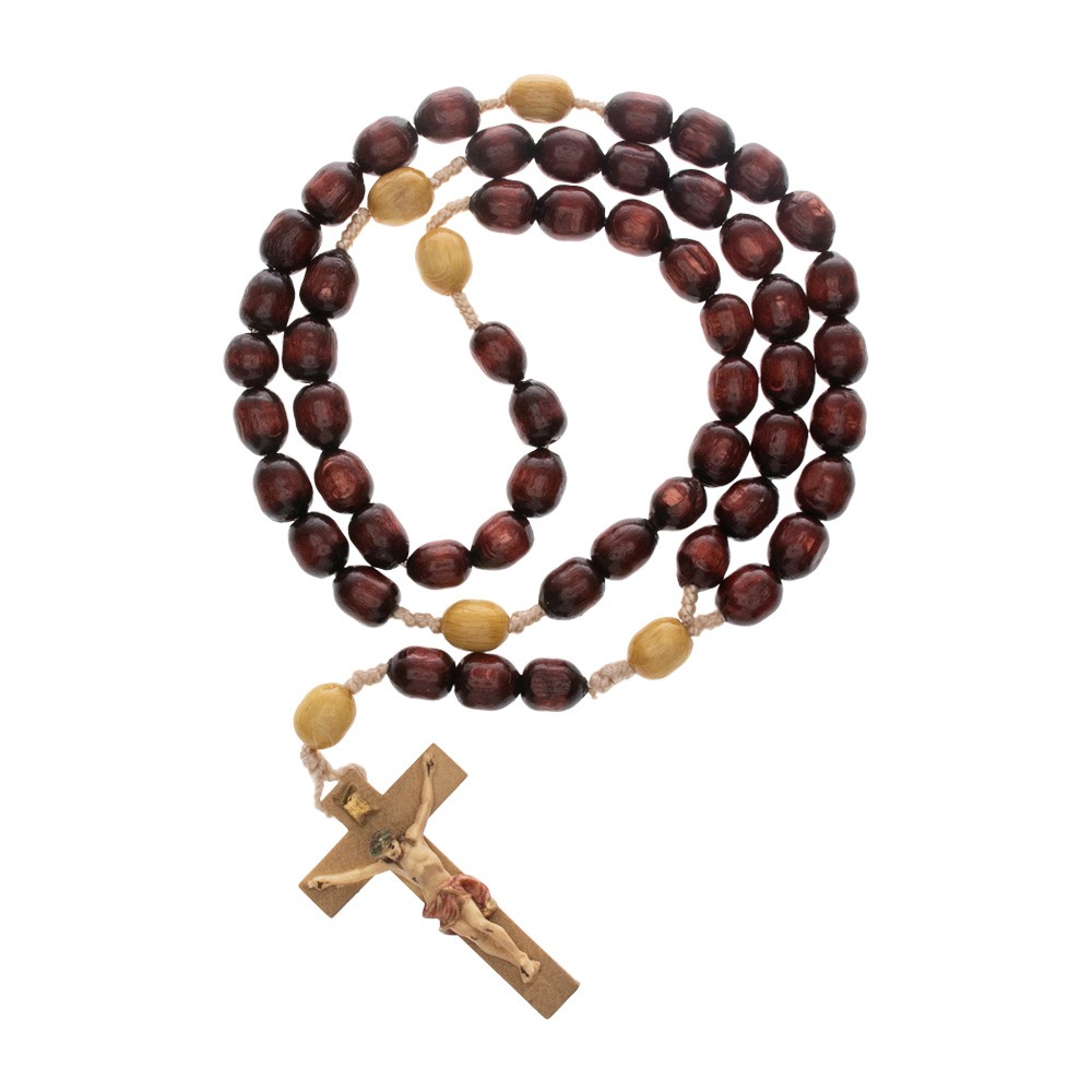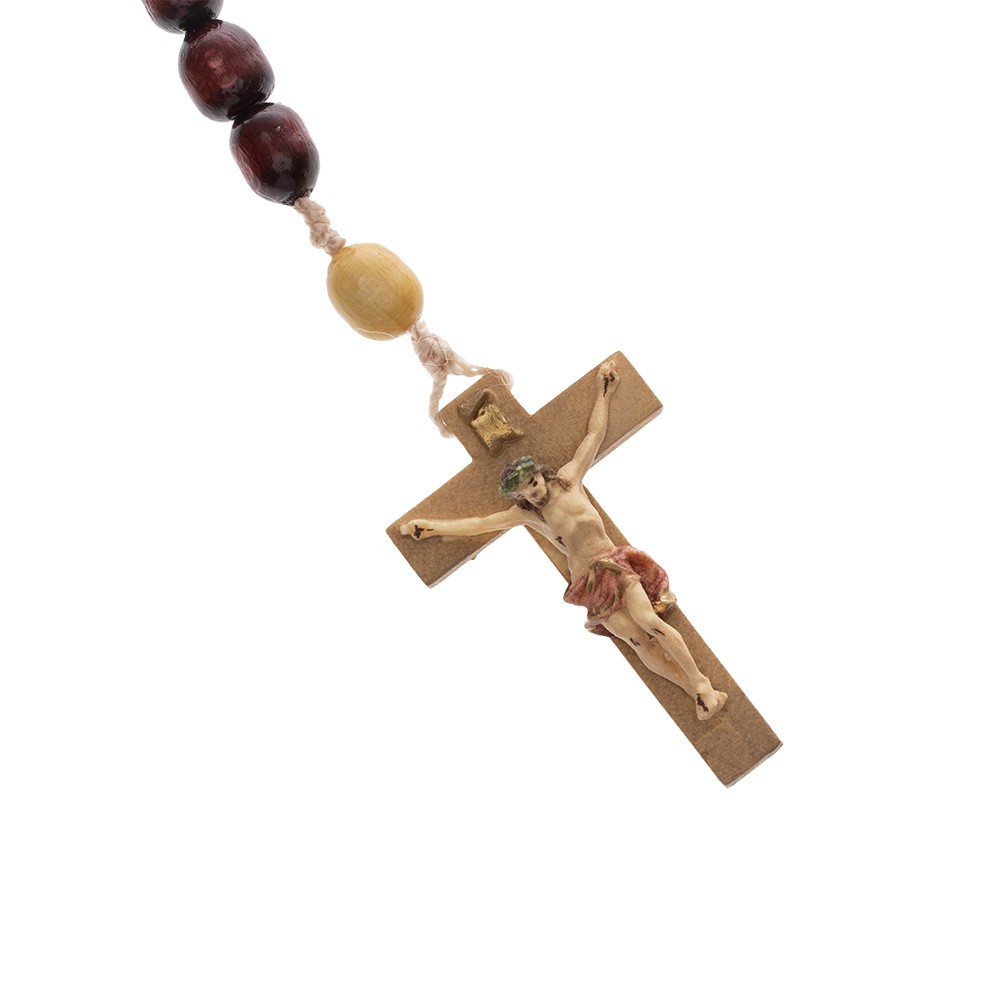Rosario artigianale con grani ovali in legno marrone, rilegati in corda e crocifisso in legno.