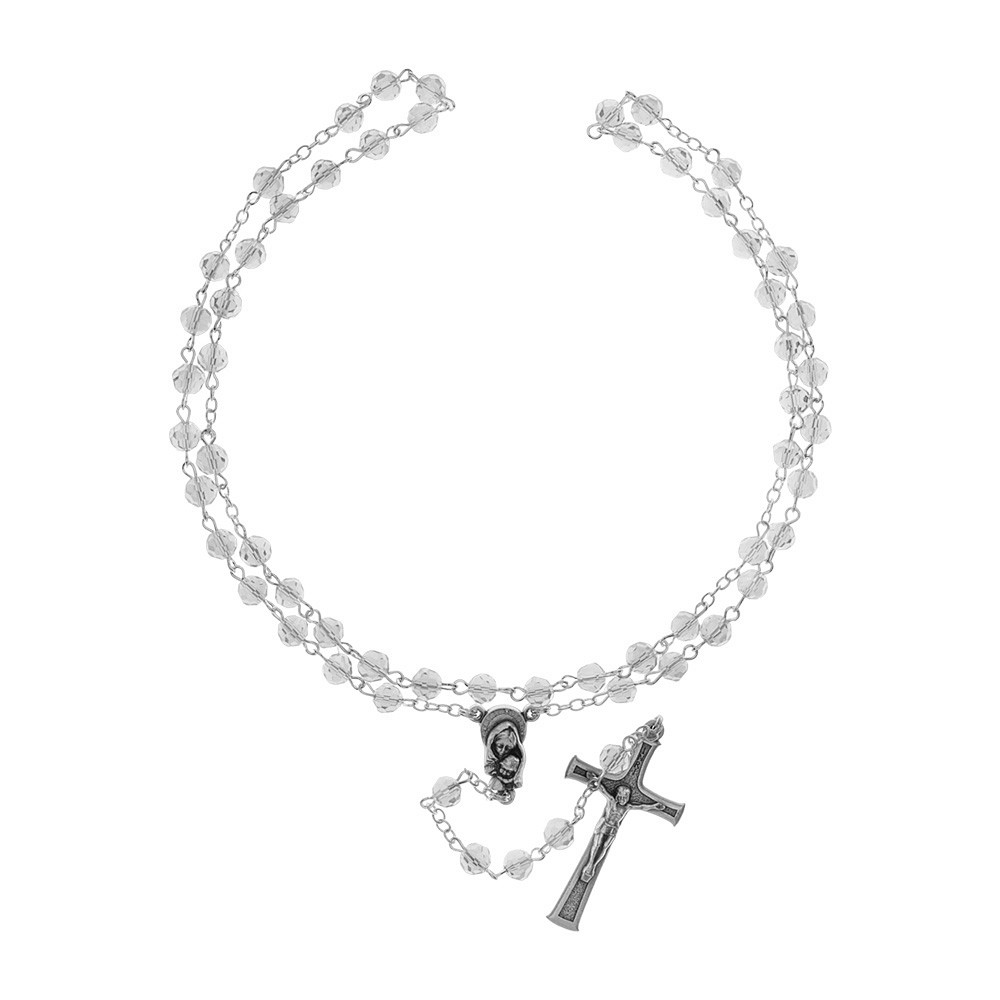 Rosario con grani in cristallo sfaccettato trasparente, legati con catenella in metallo argentato.