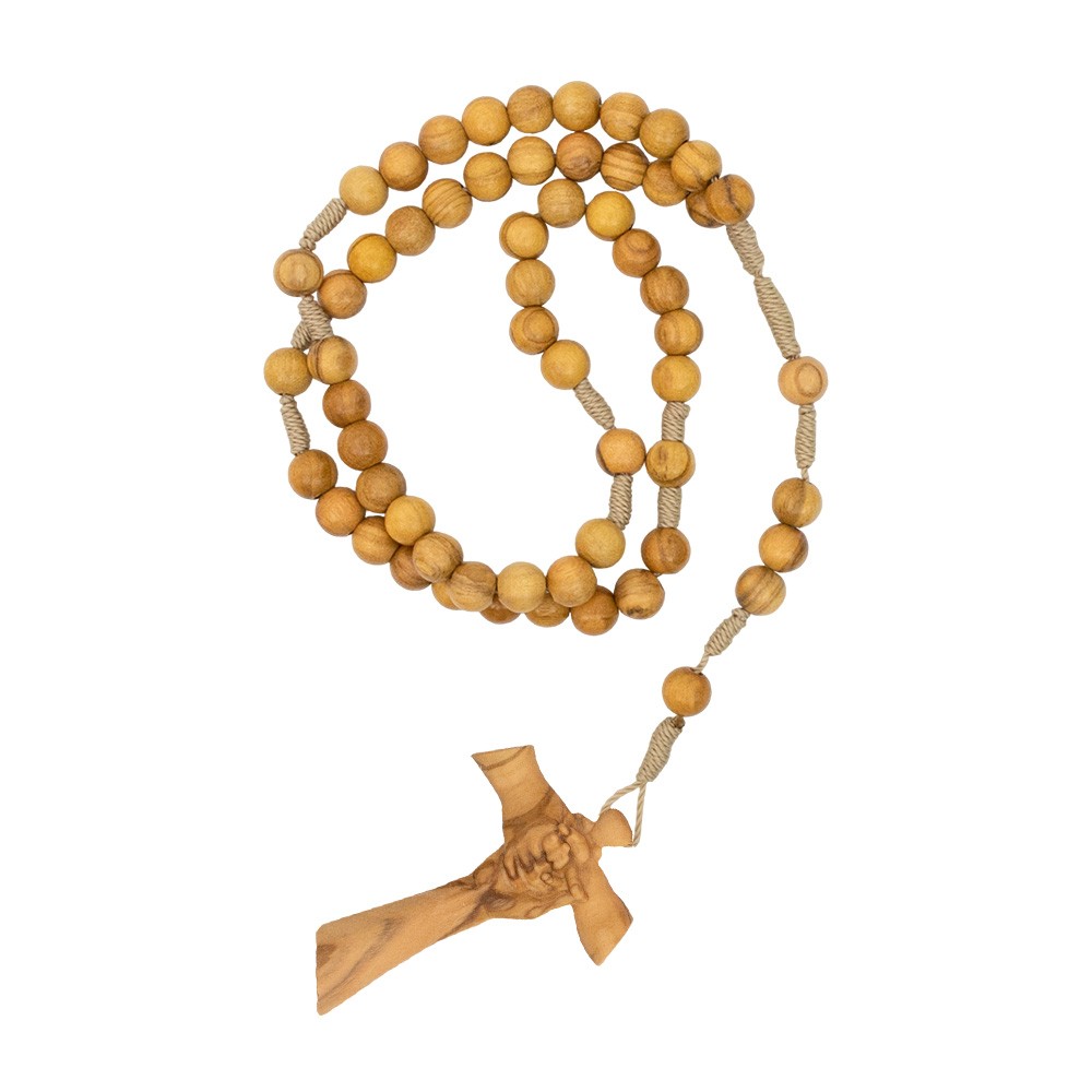 Rosario artigianale realizzato con grani tondi in legno di ulivo, rilegati in corda e crocifisso dell'amicizia.
