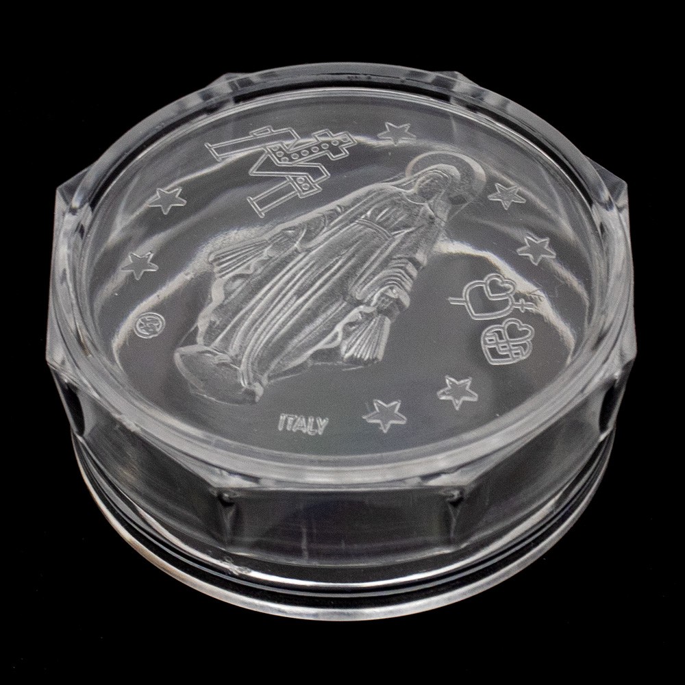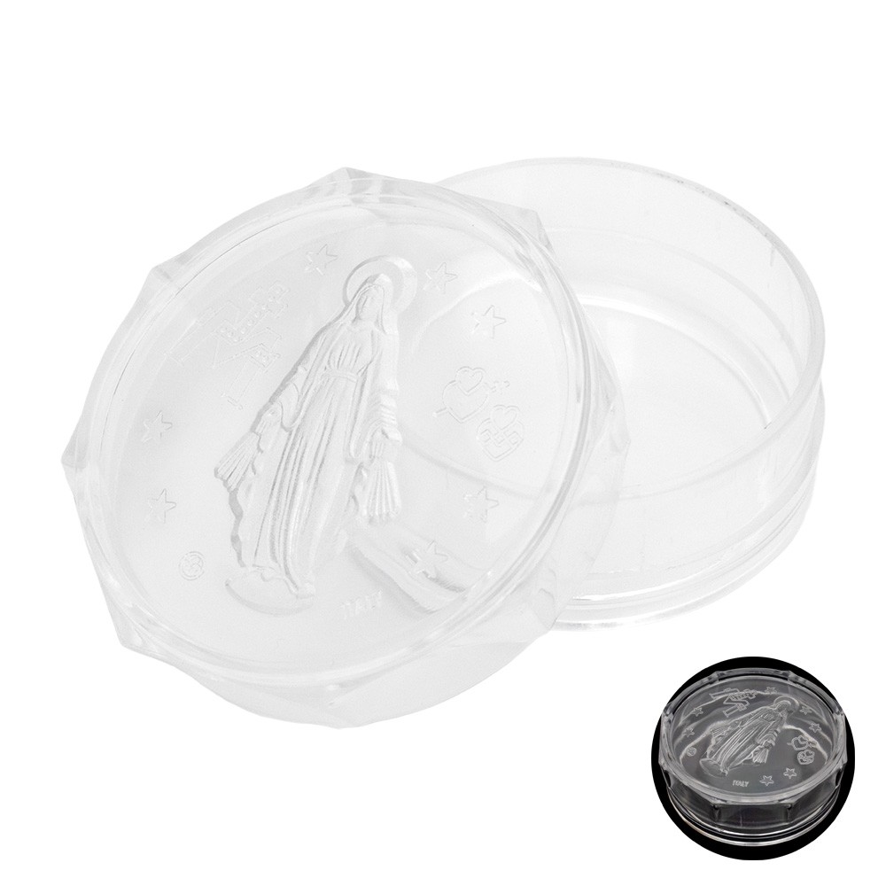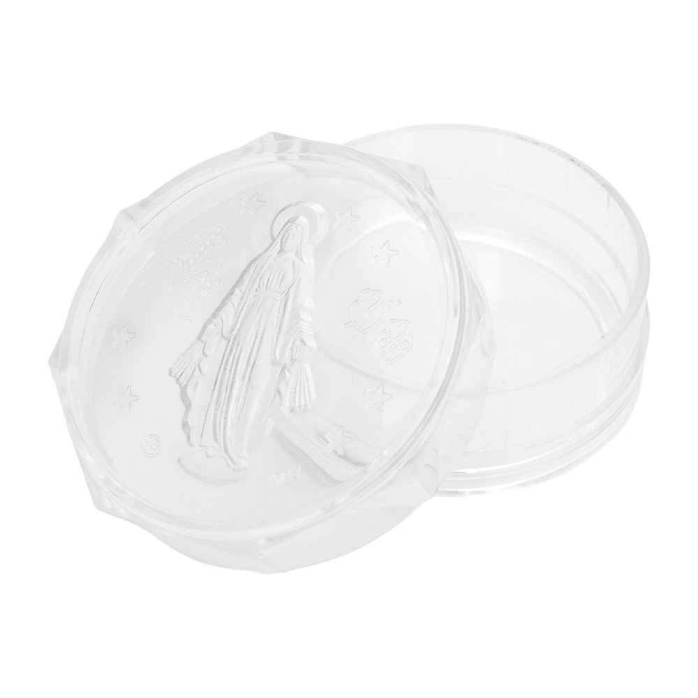 Mini porta rosario in plastica a forma ottagonale con immagine della Madonna Miracolosa.