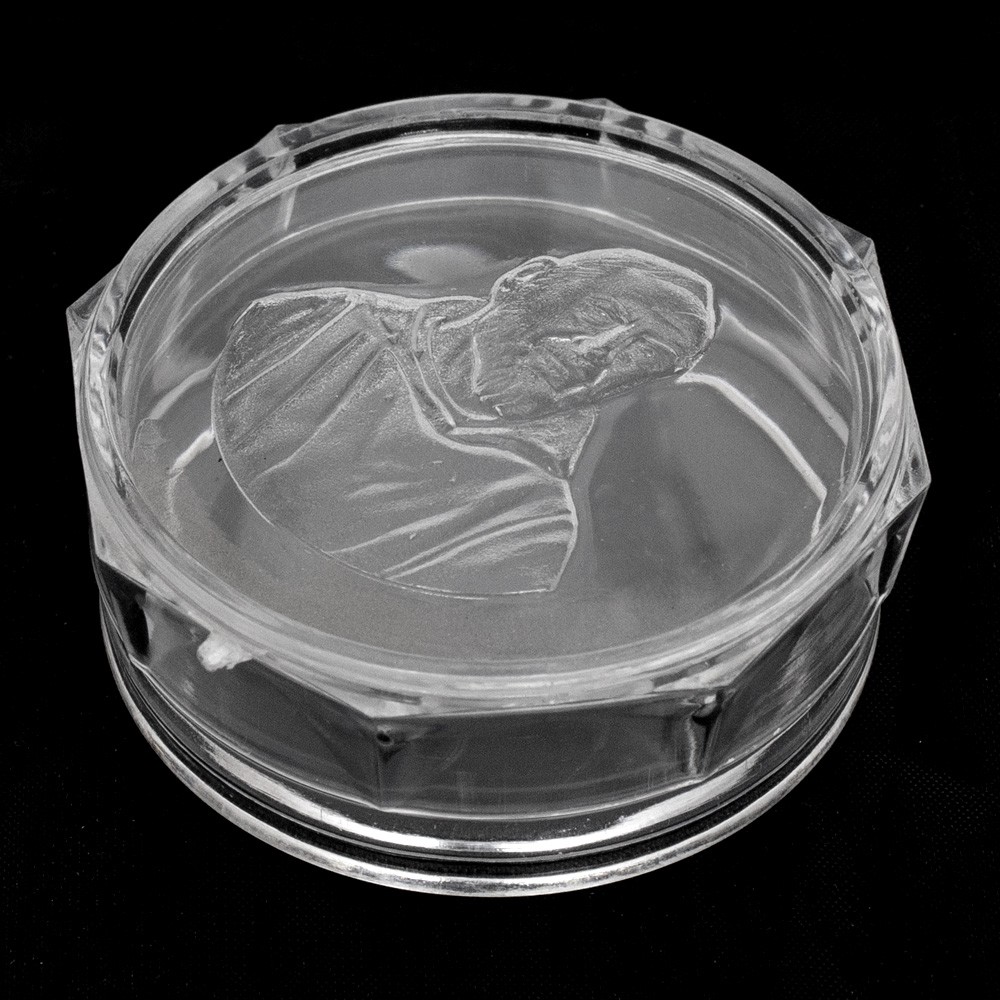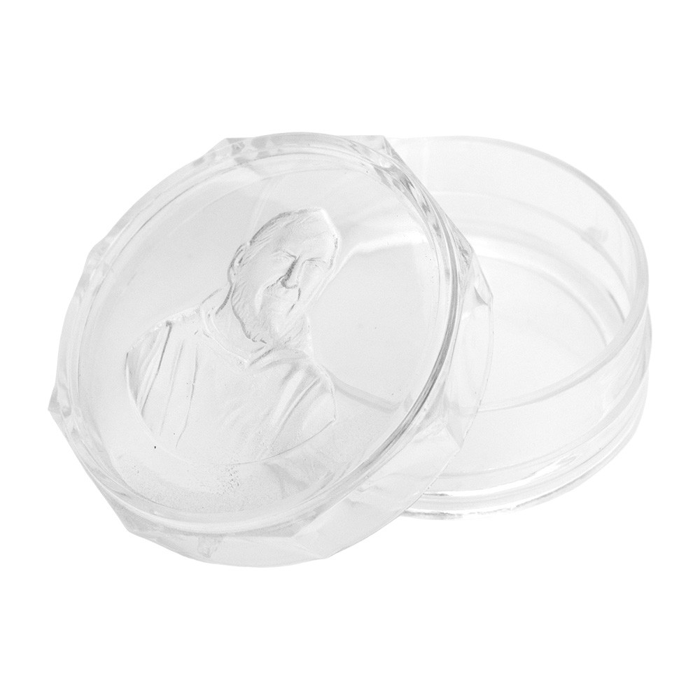 Mini porta rosario in plastica a forma ottagonale con immagine della Madonna Miracolosa.