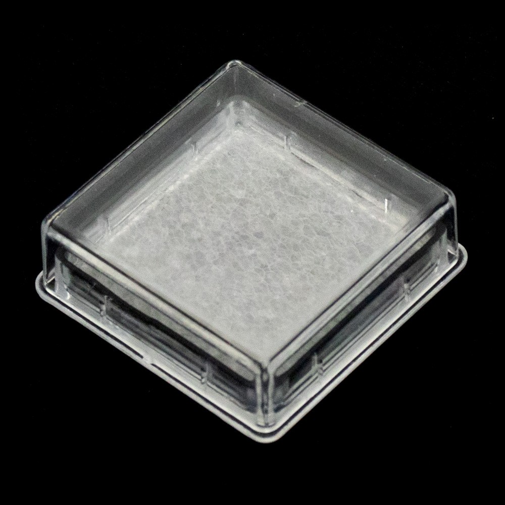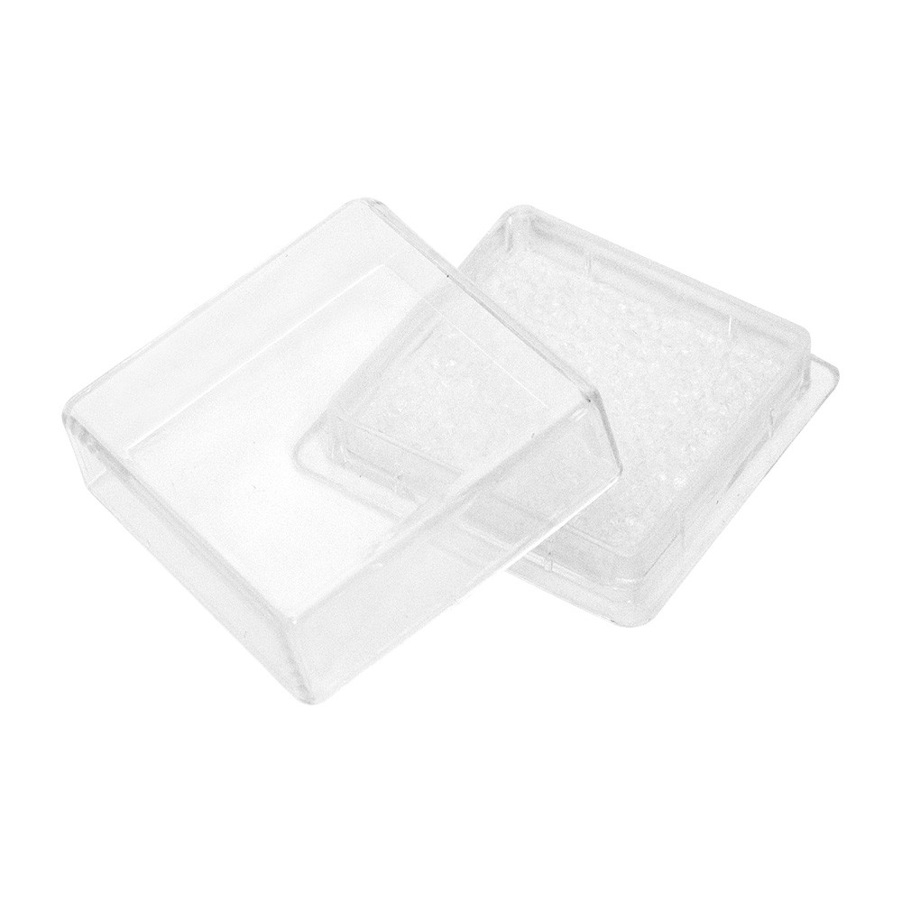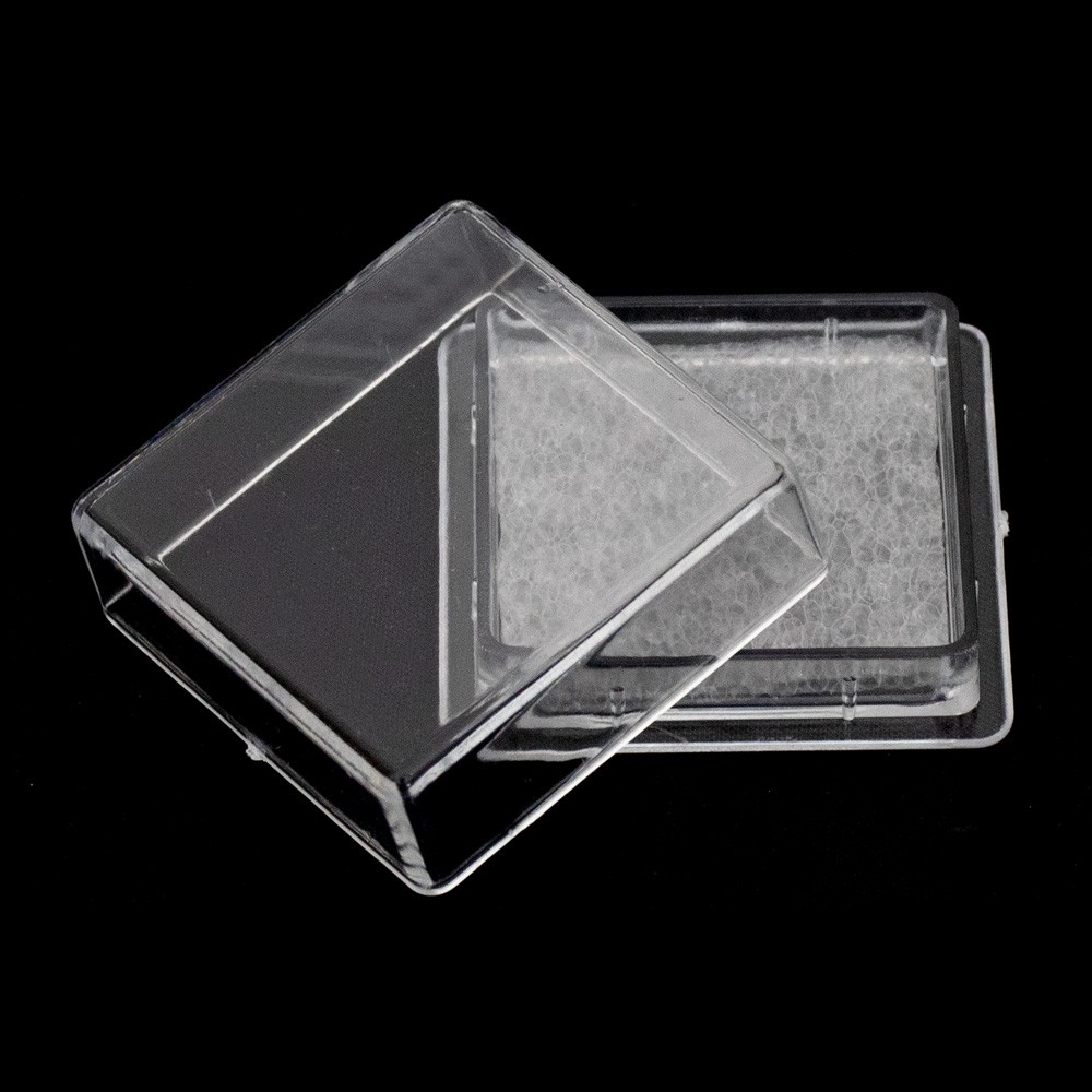 Scatola quadrata in plastica trasparente, dimensioni 3,5x3,5 cm x h 1,3 cm.
