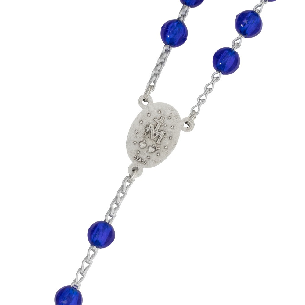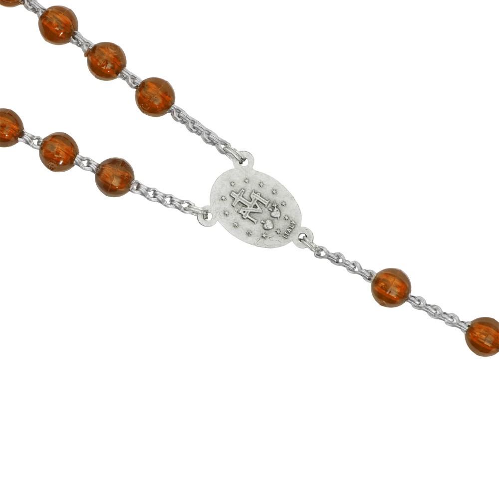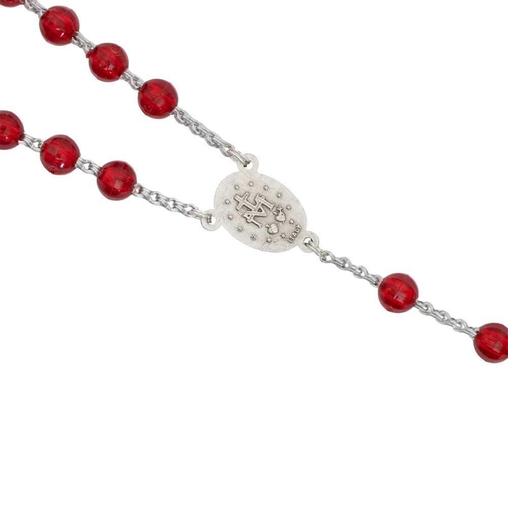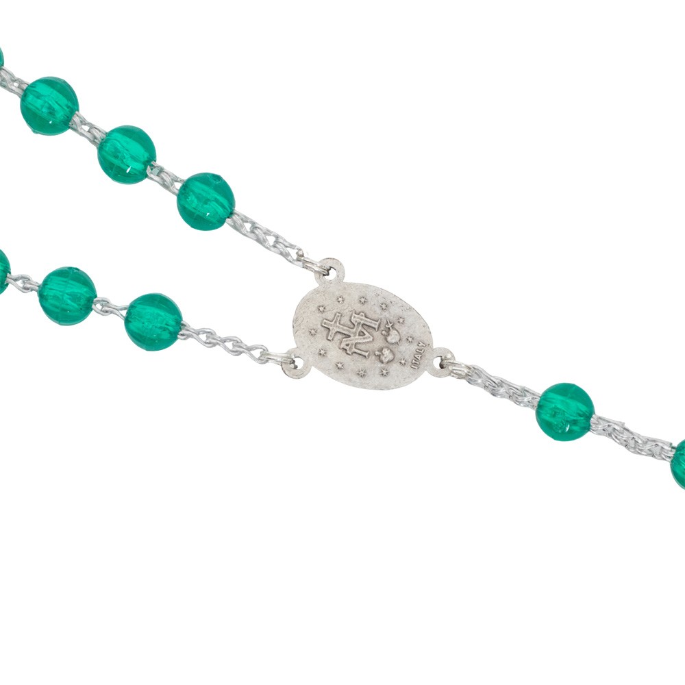 Coroncina del rosario con grani in plastica trasparente di diametro 7 mm circa. La crociera della Madonna Miracolosa, il crocifisso e la legatura sono interamente in metallo color argento.
