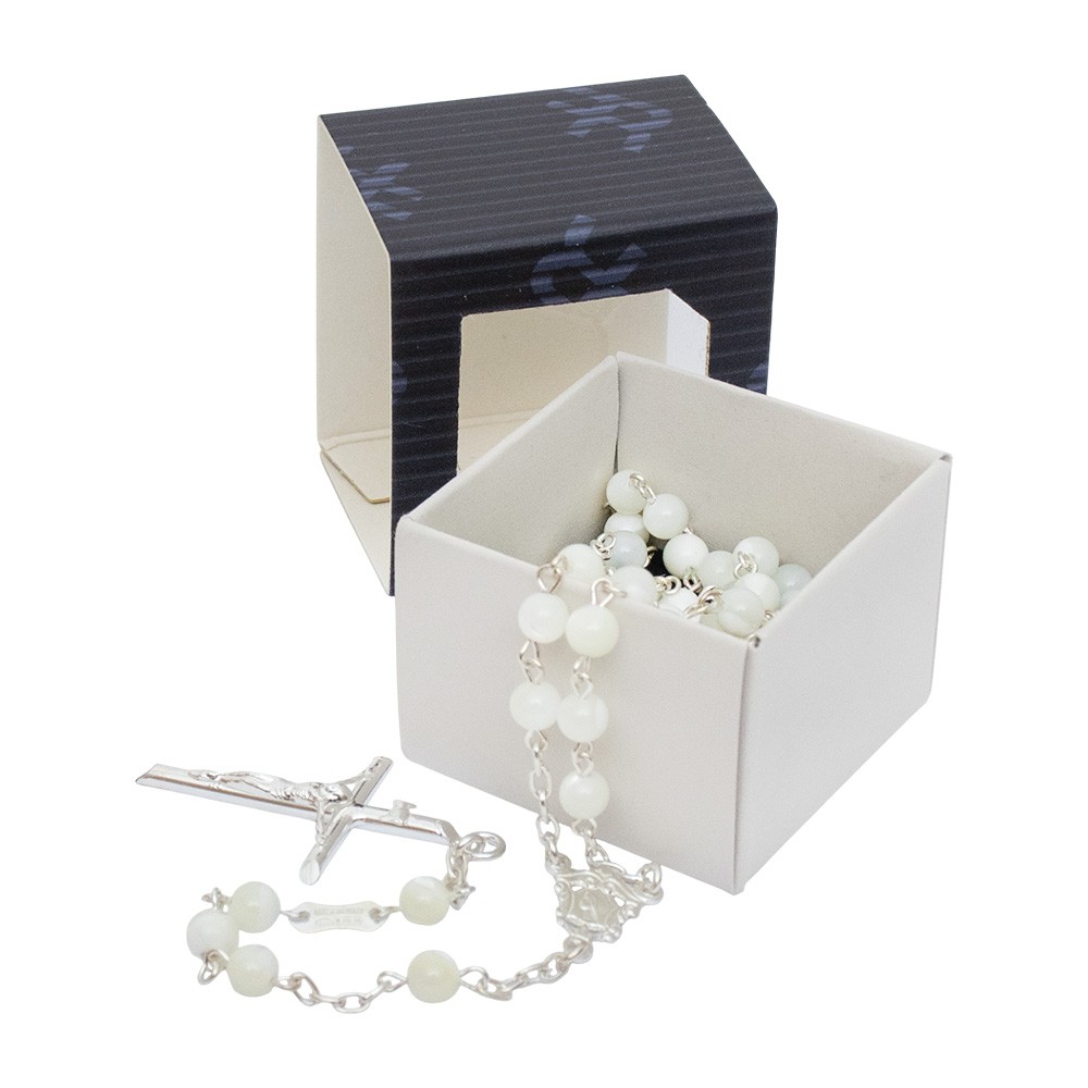 Rosario Collana in Argento e grani in vera madreperla. La crociera presenta sul davanti il volto di Maria e sul retro il volto Gesu' Cristo.