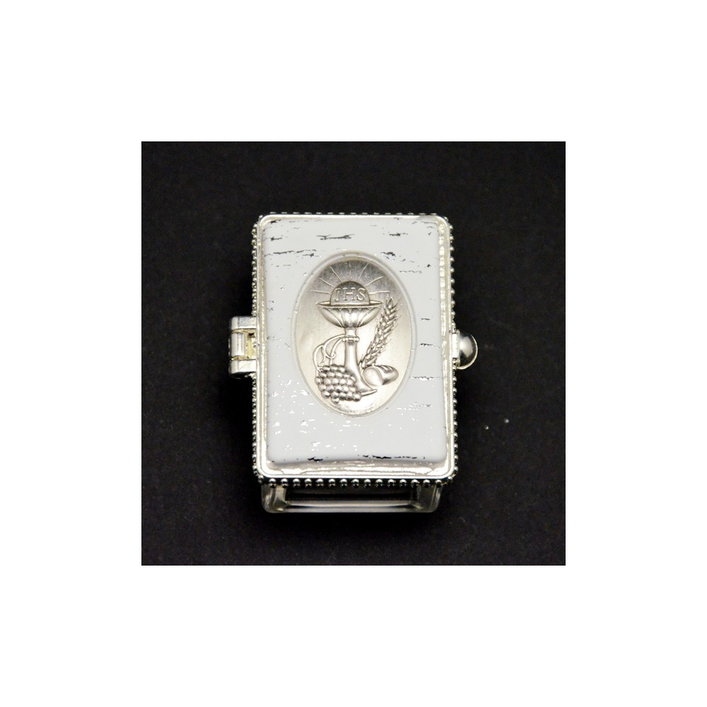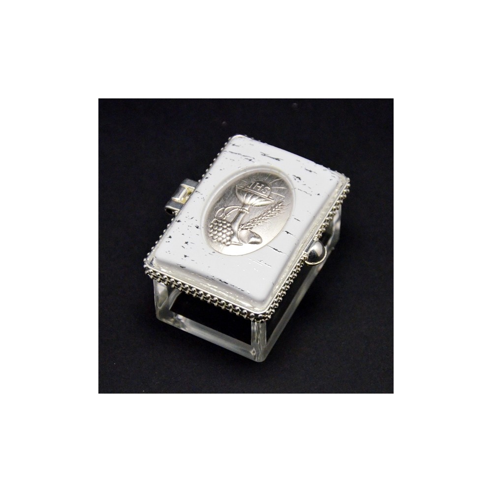 Elegante custodia Porta rosario in plastica rigida a forma rettangolare, con placca Prima Comunione in metallo argentato. La placchetta raffigura i simboli del Sacramento della Prima Comunione. Adatto a rosari con grani di piccole dimensione. Questa custodia può essere usata come bomboniera o ricordino per la Prima Comunione.