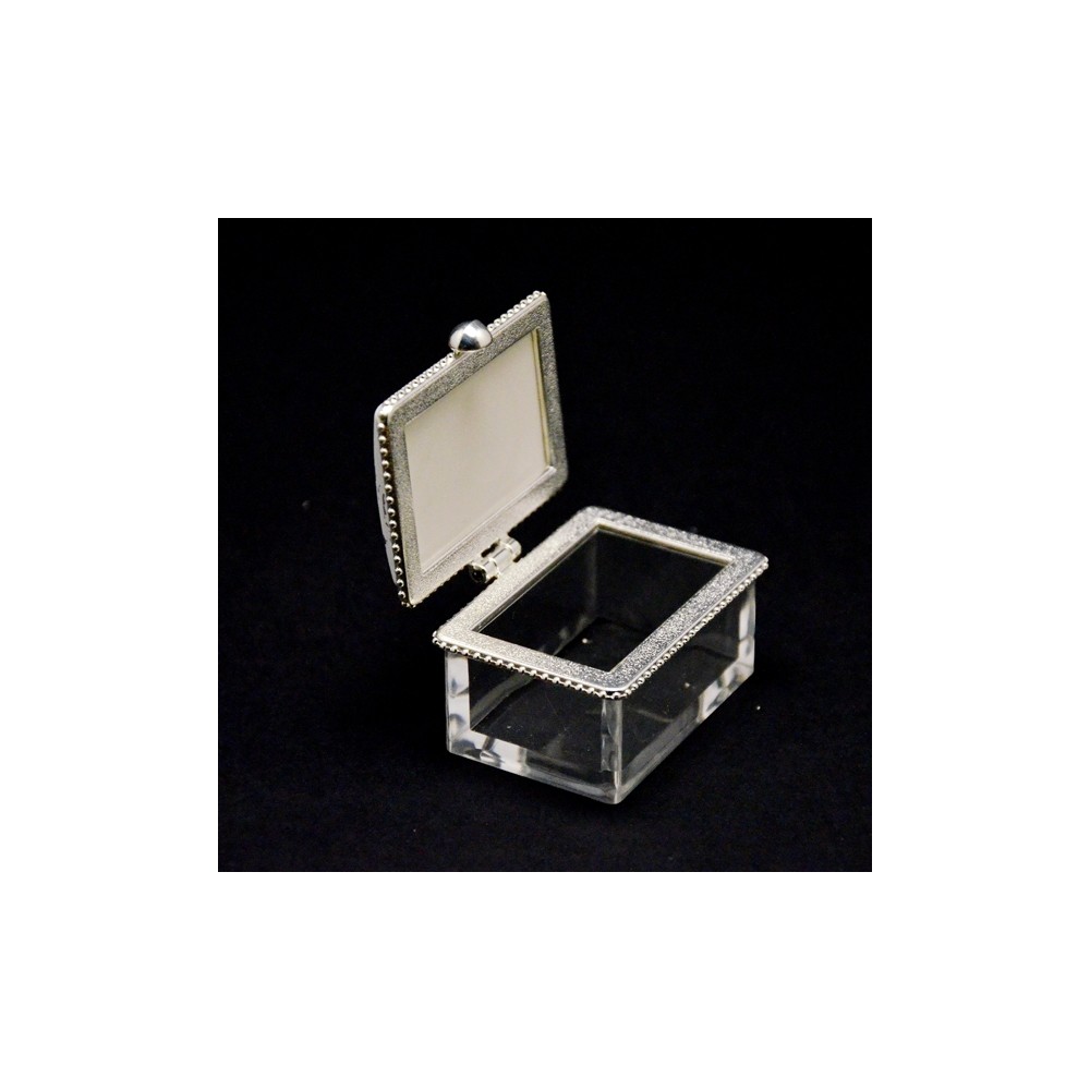 Scatola quadrata in plastica trasparente, dimensioni 3,5x3,5 cm x h 1,3 cm.