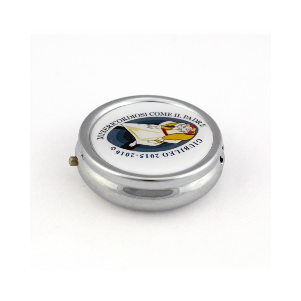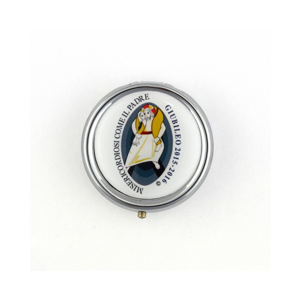 Scatola portarosario economico in plastica con logo del Giubileo della Misericordia. Questo custodia è adatta a rosari con grani di piccole dimensione. Molto leggera e utile. Prodotto italiano.