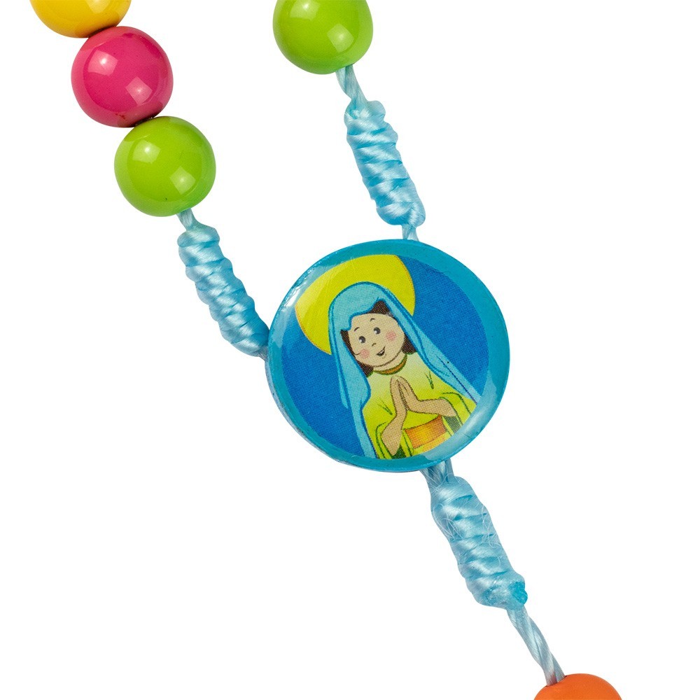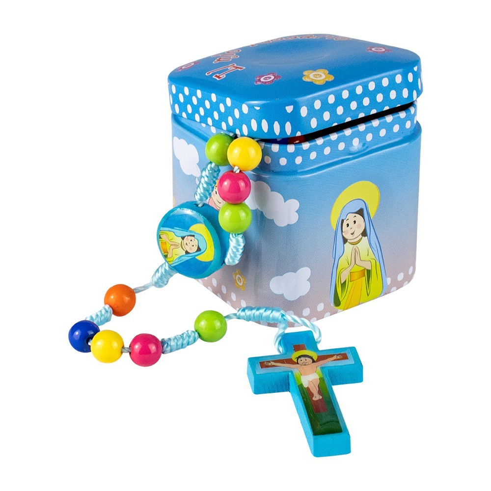 Il Mio rosario. Scatola in latta con all'interno un bellissimo rosario colorato per bambini. Il rosario è in corda con grani tondi colorati. Sul coperchio della scatolina vi è la scritta "Il mio rosario", lateralmente vi sono stampate le immagini della Madonna e degli angeli con preghiera dell'Ave Maria.